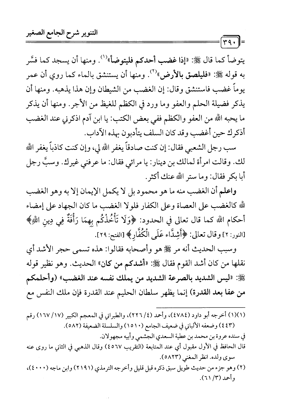 يتوضأ كما قال - صلى الله عليه وسلم -: "إذا غضب أحدكم فليتوضأ" (¬1). ومنها أن يسجد كما فسَّر به قوله - صلى الله عليه وسلم -: "فليلصق بالأرض" (¬2). ومنها أن يستنشق بالماء كما روي أن عمر يوماً غضب فاستنشق وقال: إن الغضب من الشيطان وإن هذا يذهبه. ومنها أن يذكر فضيلة الحلم والعفو وما ورد في الكظم للغيظ من الأجر. ومنها أن يذكر ما يحبه الله من العفو والكظم ففي بعض الكتب: يا ابن آدم اذكرني عند الغضب أذكرك حين أغضب وقد كان السلف يتأدبون بهذه الآداب.