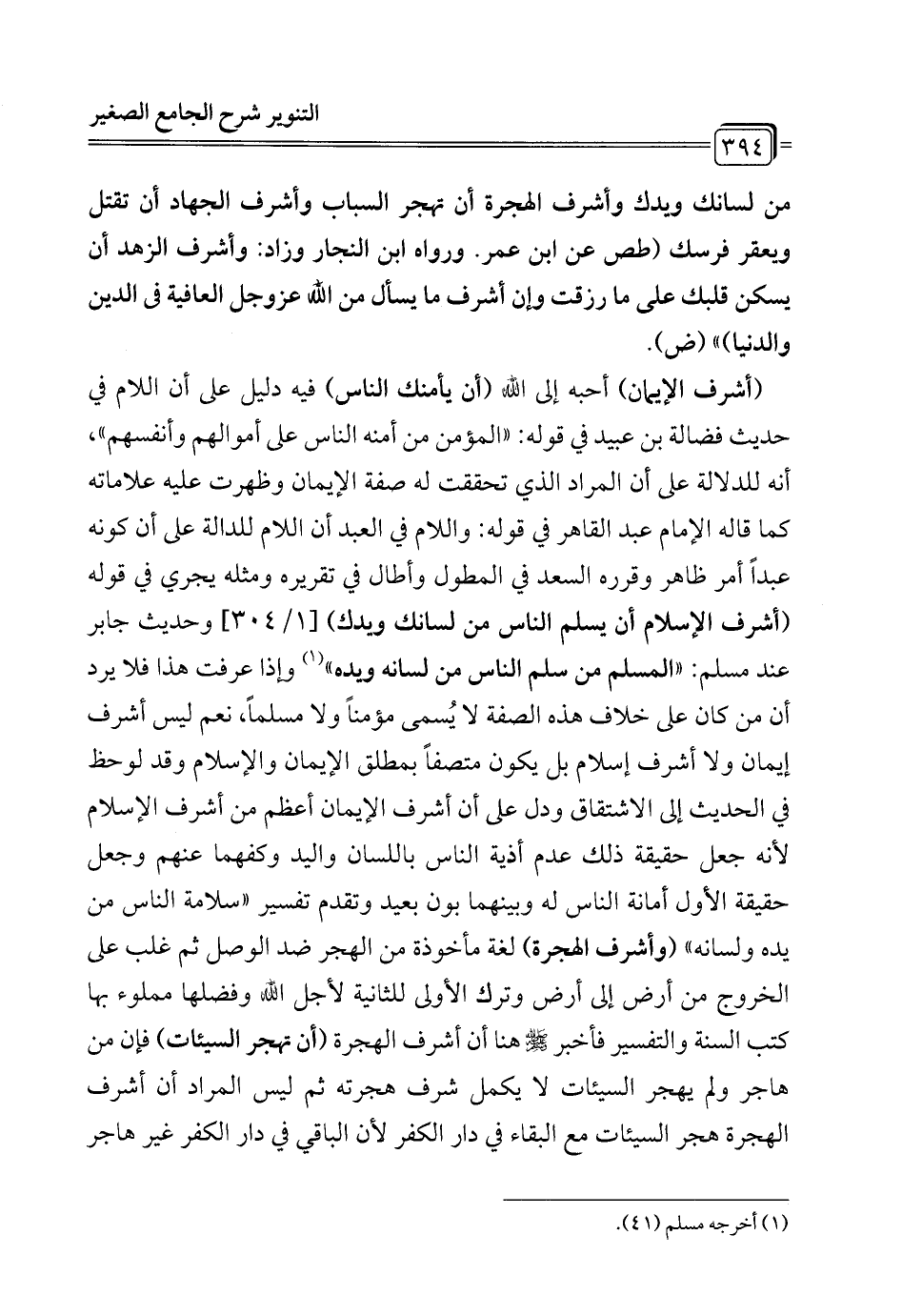 (أشرف الإيمان) أحبه إلى الله (أن يأمنك الناس) فيه دليل على أن اللام في حديث فضالة بن عبيد في قوله: "المؤمن من أمنه الناس على أموالهم وأنفسهم"، أنه للدلالة على أن المراد الذي تحققت له صفة الإيمان وظهرت عليه علاماته كما قاله الإِمام عبد القاهر في قوله: واللام في العبد أن اللام للدالة على أن كونه عبداً أمر ظاهر وقرره السعد في المطول وأطال في تقريره ومثله يجري في قوله (أشرف الإِسلام أن يسلم الناس من لسانك ويدك) [1/ 304] وحديث جابر عند مسلم: "المسلم من سلم الناس من لسانه ويده" (¬1) وإذا عرفت هذا فلا يرد أن من كان على خلاف هذه الصفة لا يُسمى مؤمناً ولا مسلماً، نعم ليس أشرف إيمان ولا أشرف إسلام بل يكون متصفاً بمطلق الإيمان والإِسلام وقد لوحظ في الحديث إلى الاشتقاق ودل على أن أشرف الإيمان أعظم من أشرف الإسلام لأنه جعل حقيقة ذلك عدم أذية الناس باللسان واليد وكفهما عنهم وجعل حقيقة الأول أمانة الناس له وبينهما بون بعيد وتقدم تفسير "سلامة الناس من يده ولسانه" (وأشرف الهجرة) لغة مأخوذة من الهجر ضد الوصل ثم غلب على الخروج من أرض إلى أرض وترك الأولى للثانية لأجل الله وفضلها مملوء بها كتب السنة والتفسير فأخبر - صلى الله عليه وسلم - هنا أن أشرف الهجرة (أن تهجر السيئات) فإن من هاجر ولم يهجر السيئات لا يكمل شرف هجرته ثم ليس المراد أن أشرف الهجرة هجر السيئات مع البقاء في دار الكفر لأن الباقي في دار الكفر غير هاجر