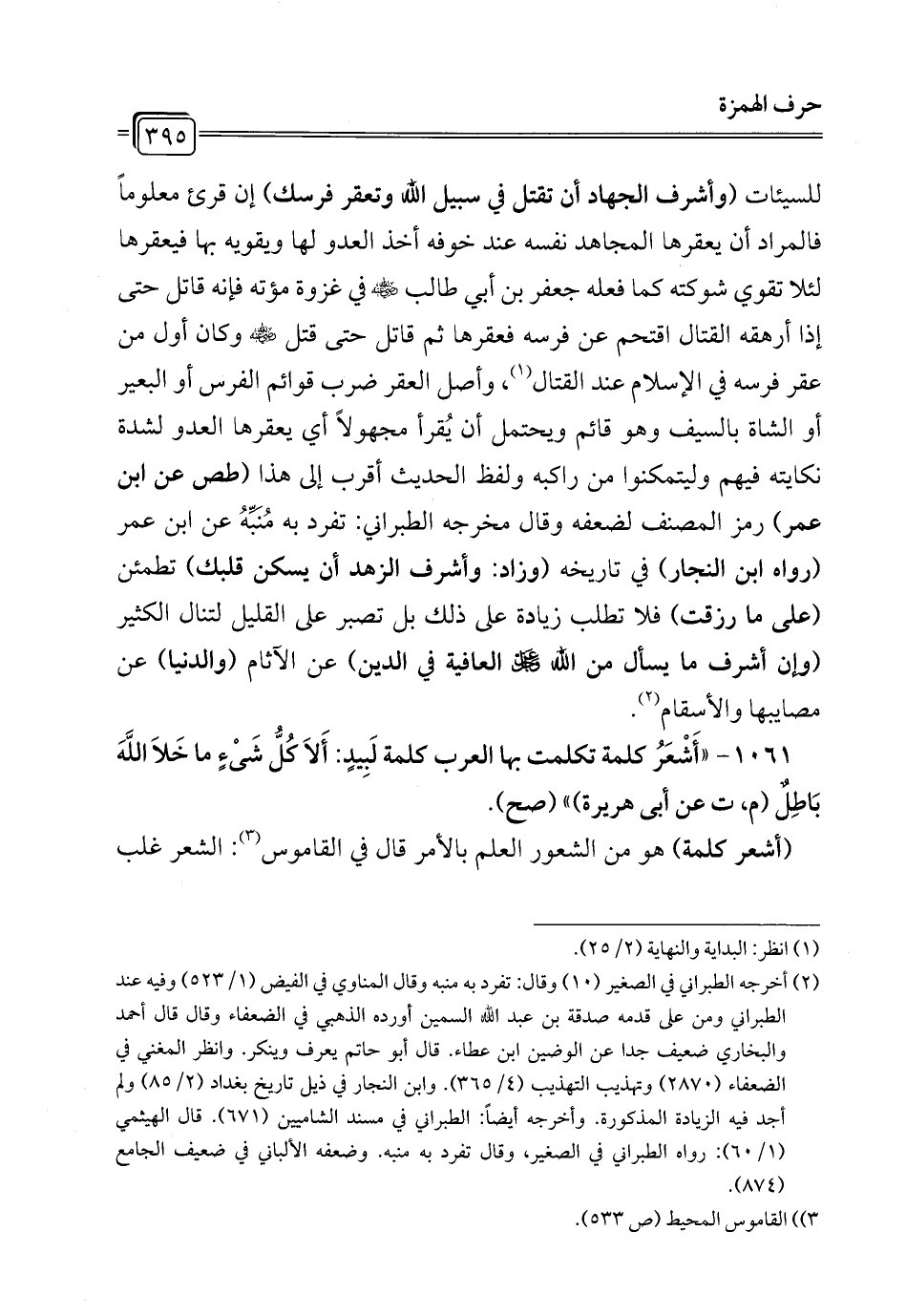 1061 - "أَشْعَرُ كلمة تكلمت بها العرب كلمة لَبِيدٍ: أَلا كُلُّ شَيءٍ ما خَلاَ اللهَ بَاطِلُّ (م، ت عن أبي هريرة) " (صح).