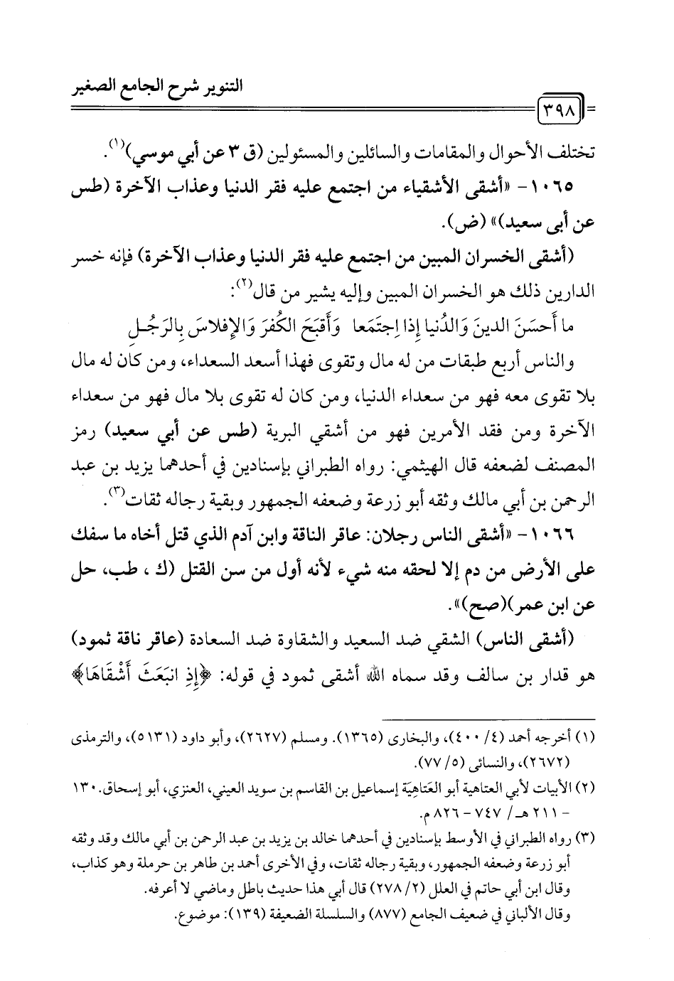 1066 - "أشقى الناس رجلان: عاقر الناقة وابن آدم الذي قتل أخاه ما سفك على الأرض من دم إلا لحقه منه شيء لأنه أول من سن القتل (ك، طب، حل عن ابن عمر) (صح) ".
