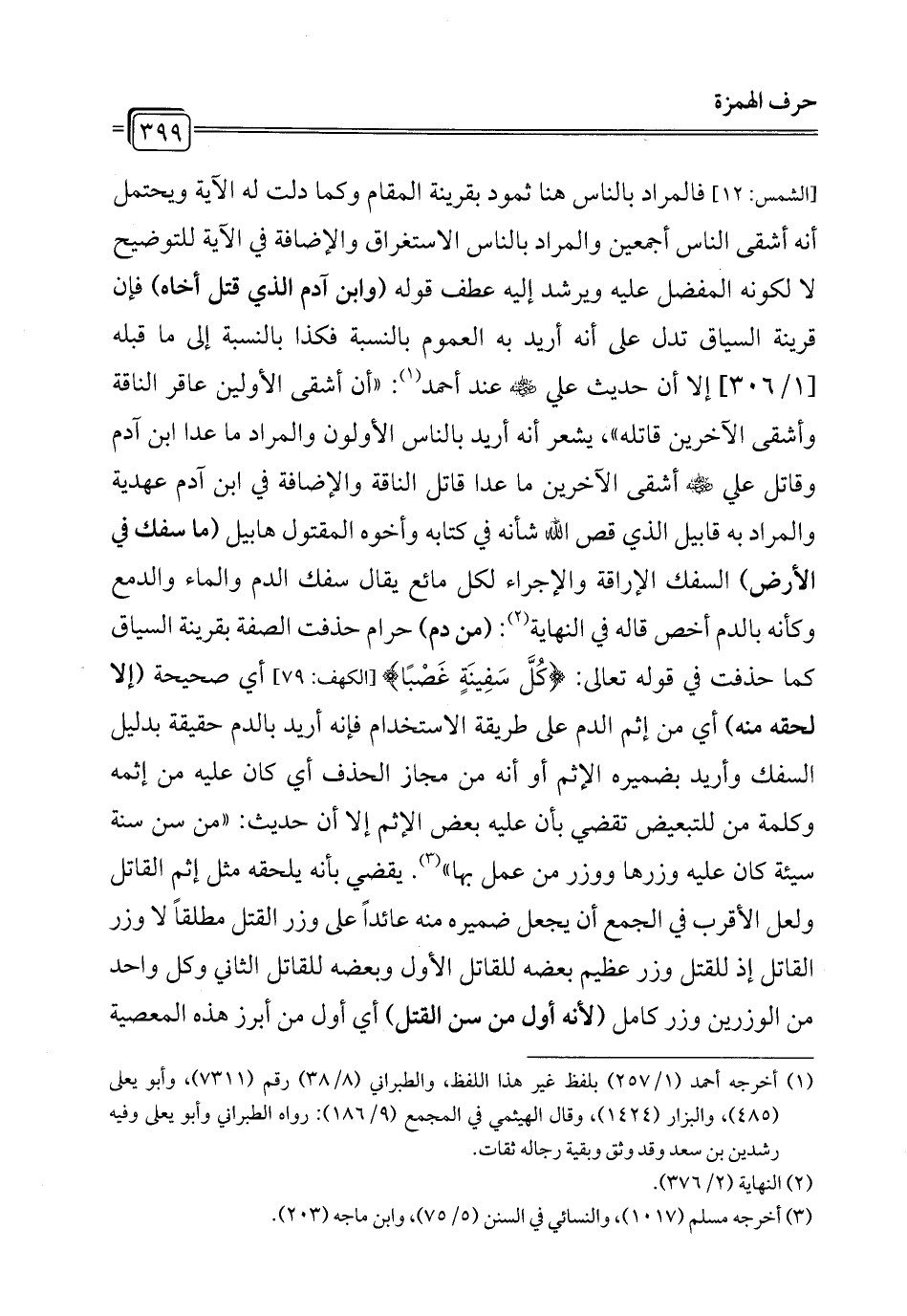 [الشمس: 12] فالمراد بالناس هنا ثمود بقرينة المقام وكما دلت له الآية ويحتمل أنه أشقى الناس أجمعين والمراد بالناس الاستغراق والإضافة في الآية للتوضيح لا لكونه المفضل عليه ويرشد إليه عطف قوله (وابن آدم الذي قتل أخاه) فإن قرينة السياق تدل على أنه أريد به العموم بالنسبة فكذا بالنسبة إلى ما قبله [1/ 306] إلا أن حديث علي -رضي الله عنه - عند أحمد (¬1): "أن أشقى الأولين عاقر الناقة وأشقى الآخرين قاتله"، يشعر أنه أريد بالناس الأولون والمراد ما عدا ابن آدم وقاتل علي -رضي الله عنه - أشقى الآخرين ما عدا قاتل الناقة والإضافة في ابن آدم عهدية والمراد به قابيل الذي قص الله شأنه في كتابه وأخوه المقتول هابيل (ما سفك في الأرض) السفك الإراقة والإجراء لكل مائع يقال سفك الدم والماء والدمع وكأنه بالدم أخص قاله في النهاية (¬2): (من دم) حرام حذفت الصفة بقرينة السياق كما حذفت في قوله تعالى: {كُلَّ سَفِينَةٍ غَصْبًا} [الكهف: 79] أي صحيحة (إلا لحقه منه) أي من إثم الدم على طريقة الاستخدام فإنه أريد بالدم حقيقة بدليل السفك وأريد بضميره الإثم أو أنه من مجاز الحذف أي كان عليه من إثمه وكلمة من للتبعيض تقضي بأن عليه بعض الإثم إلا أن حديث: "من سن سنة سيئة كان عليه وزرها ووزر من عمل بها" (¬3). يقضي بأنه يلحقه مثل إثم القاتل ولعل الأقرب في الجمع أن يجعل ضميره منه عائداً على وزر القتل مطلقاً لا وزر القاتل إذ للقتل وزر عظيم بعضه للقاتل الأول وبعضه للقاتل الثاني وكل واحد من الوزرين وزر كامل (لأنه أول من سن القتل) أي أول من أبرز هذه المعصية