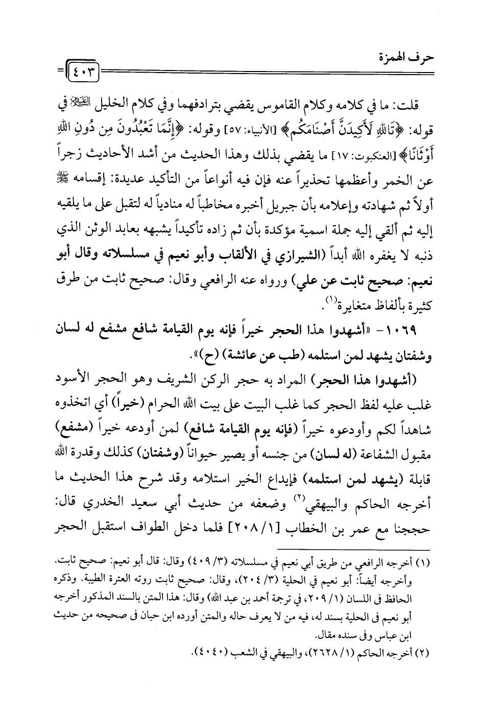 1069 - "أشهدوا هذا الحجر خيراً فإنه يوم القيامة شافع مشفع له لسان وشفتان يشهد لمن استلمه (طب عن عائشة) (ح) ".