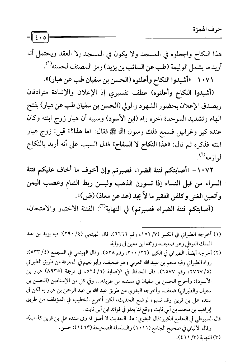 1071 - "أشيدوا النكاح وأعلنوه (الحسن بن سفيان طب عن هبار) ".