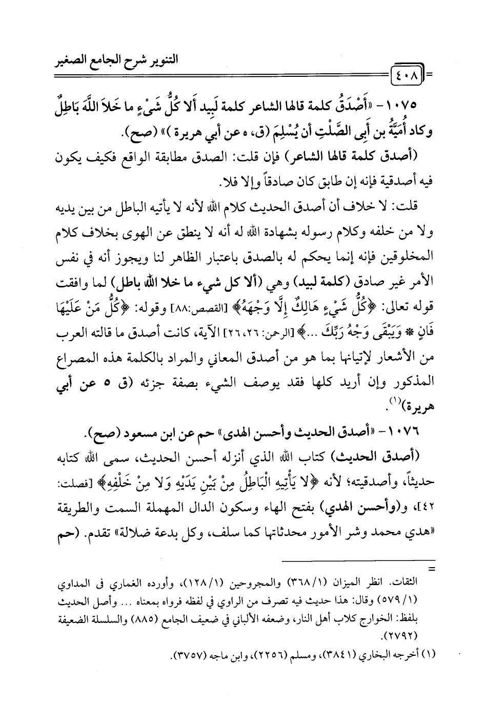 1075 - "أَصْدَقُ كلمة قالها الشاعر كلمة لَبِيد أَلا كُلُّ شَيءٍ ما خَلاَ اللهَ بَاطِلٌ وكاد أُمَيَّةُ بن أَبِي الصَّلْتِ أن يُسْلِمَ (ق، هـ عن أبي هريرة) " (صح).