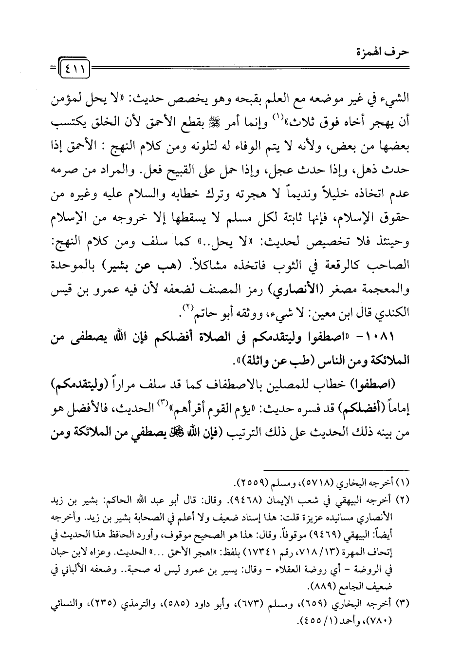 (¬2) أخرجه البيهقي في شعب الإيمان (9468). وقال: قال أبو عبد الله الحاكم: بشير بن زيد الأنصاري مسانيده عزيزة قلت: هذا إسناد ضعيف ولا أعلم في الصحابة بشير بن زيد. وأخرجه أيضاً: البيهقي (9469) موقوفاً. وقال: هذا هو الصحيح موقوف وأورد الحافظ هذا الحديث في إتحاف المهرة (13/ 718، رقم 17341) بلفظ: "اهجر الأحمق ... " الحديث. وعزاه لابن حبان في الروضة -أي روضة العقلاء- وقال: يسير بن عمرو ليس له صحبة .. وضعفه الألباني في ضعيف الجامع (889).