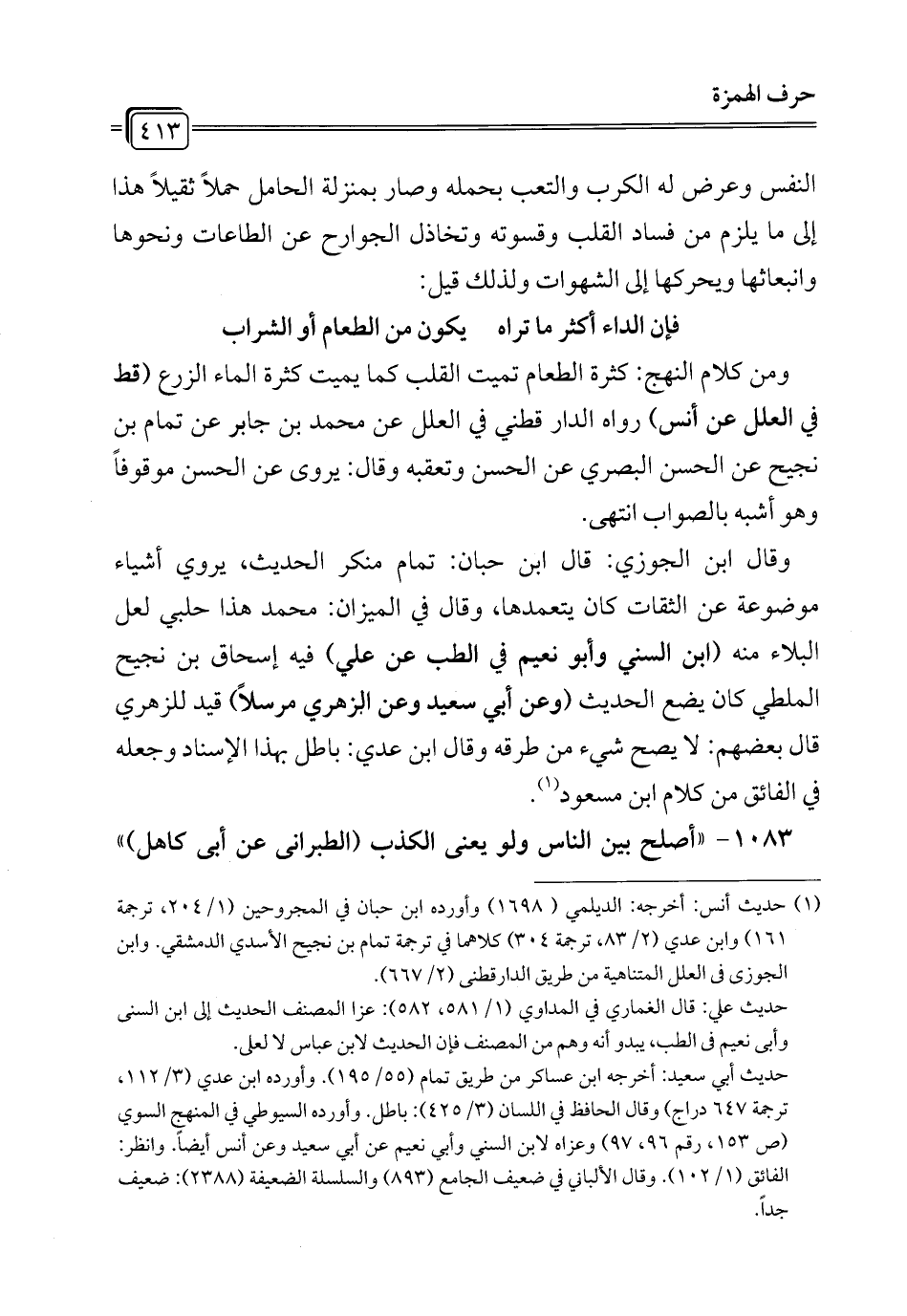 ومن كلام النهج: كثرة الطعام تميت القلب كما يميت كثرة الماء الزرع (قط في العلل عن أنس) رواه الدارقطني في العلل عن محمَّد بن جابر عن تمام بن نجيح عن الحسن البصري عن الحسن وتعقبه وقال: يروى عن الحسن موقوفاً وهو أشبه بالصواب انتهى.