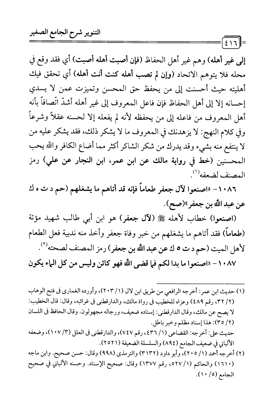 1086 - "اصنعوا لآل جعفر طعاماً فإنه قد أتاهم ما يشغلهم (حم د ت هـ ك عن عبد الله بن جعفر" (صح).