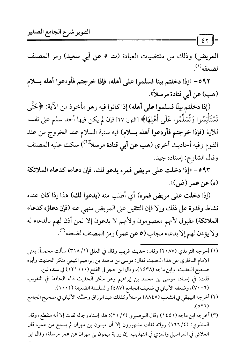 المريض) وذلك من مقتضيات العيادة (ت 5 عن أبي سعيد) رمز المصنف لضعفه (¬1).