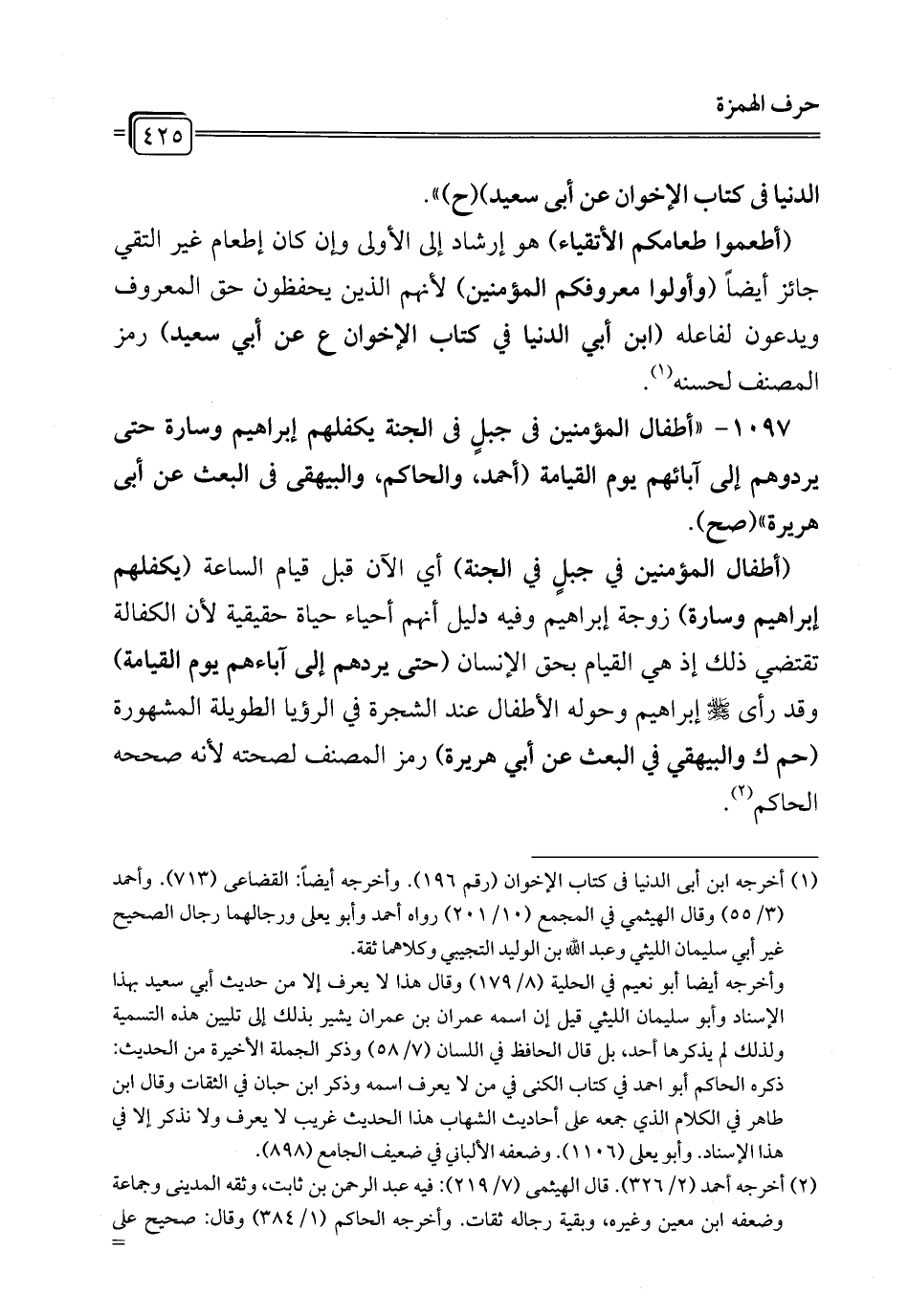 1097 - "أطفال المؤمنين في جبلٍ في الجنة يكفلهم إبراهيم وسارة حتى يردوهم إلى آبائهم يوم القيامة (أحمد، والحاكم، والبيهقي في البعث عن أبي هريرة" (صح).