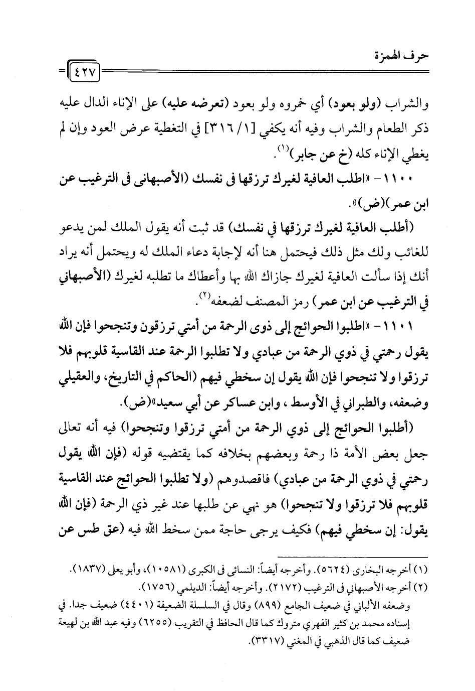1101 - "اطلبوا الحوائج إلى ذوى الرحمة من أمتي ترزقون وتنجحوا فإن الله يقول رحمتي في ذوي الرحمة من عبادي ولا تطلبوا الرحمة عند القاسية قلوبهم فلا ترزقوا ولا تنجحوا فإن الله يقول إن سخطي فيهم (الحاكم في التاريخ، والعقيلي وضعفه، والطبراني في الأوسط، وابن عساكر عن أبي سعيد" (ض).