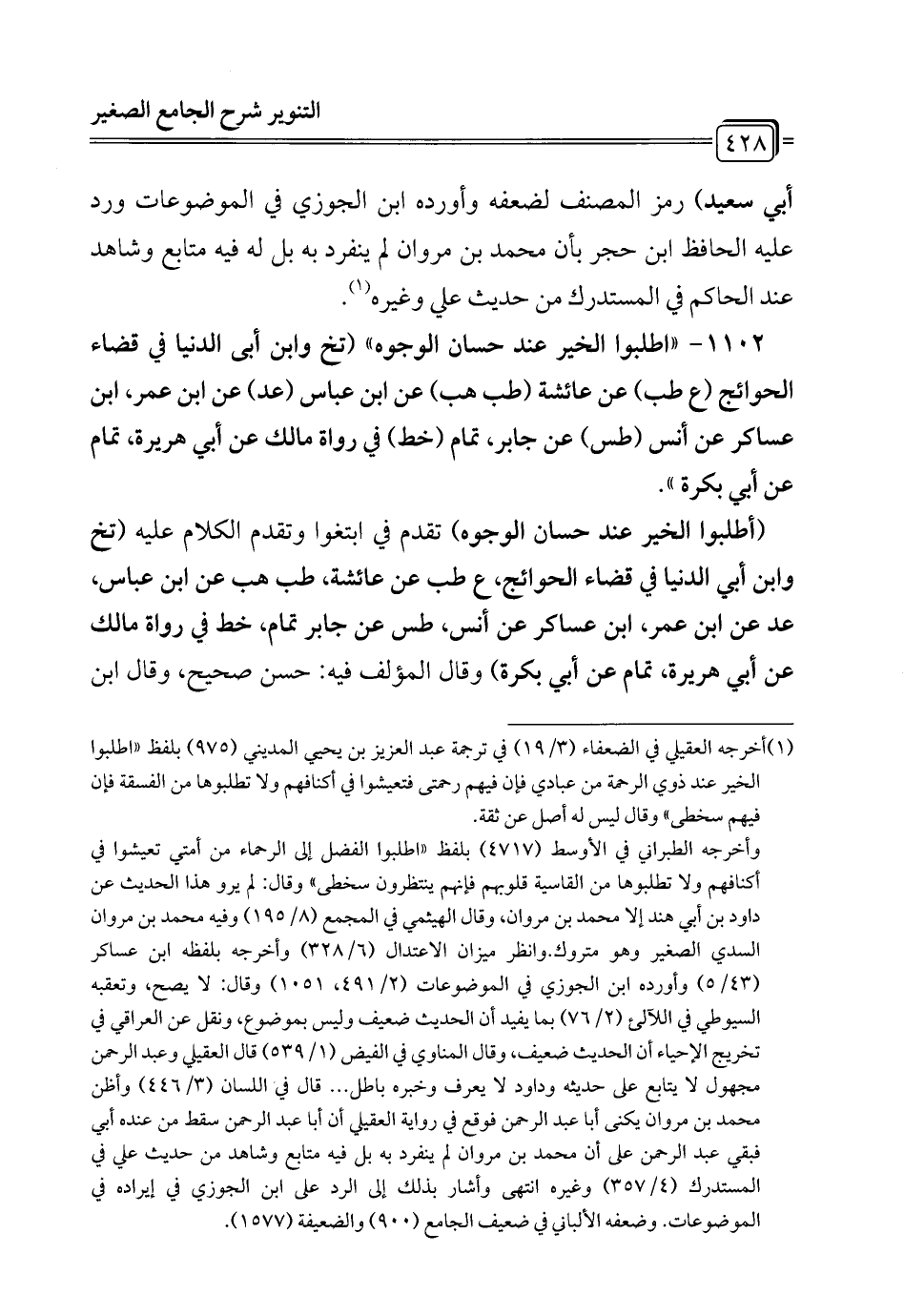 1102 - "اطلبوا الخير عند حسان الوجوه" (تخ وابن أبي الدنيا في قضاء الحوائج (ع طب) عن عائشة (طب هب) عن ابن عباس (عد) عن ابن عمر، ابن عساكر عن أنس (طس) عن جابر، تمام (خط) في رواة مالك عن أبي هريرة، تمام عن أبي بكرة".
