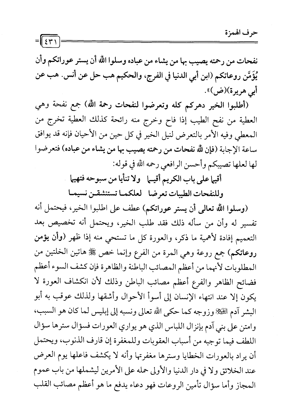 نفحات من رحمته يصيب بها من يشاء من عباده وسلوا الله أن يستر عوراتكم وأن يُؤَمَّن روعاتكم (ابن أبي الدنيا في الفرج، والحكيم هب حل عن أنس. هب عن أبي هريرة) (ض) ".