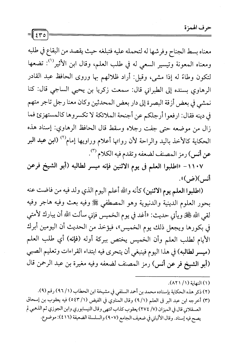 1107 - "اطلبوا العلم في يوم الاثنين فإنه ميسر لطالبه (أبو الشيخ فرعن أنس) (ض) ".