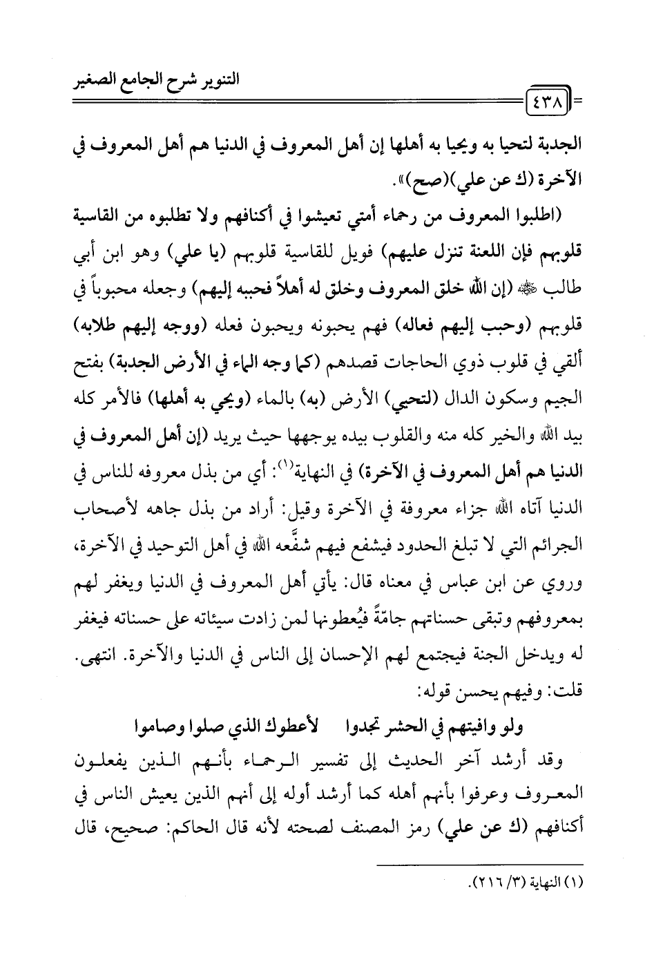 (اطلبوا المعروف من رحماء أمتي تعيشوا في أكنافهم ولا تطلبوه من القاسية قلوبهم فإن اللعنة تنزل عليهم) فويل للقاسية قلوبهم (يا علي) وهو ابن أبي طالب - رضي الله عنه - (إن الله خلق المعروف وخلق له أهلاً فحببه إليهم) وجعله محبوباً في قلوبهم (وحبب إليهم فعاله) فهم يحبونه ويحبون فعله (ووجه إليهم طلابه) ألقي في قلوب ذوي الحاجات قصدهم (كما وجه الماء في الأرض الجدبة) بفتح الجيم وسكون الدال (لتحيي) الأرض (به) بالماء (ويحي به أهلها) فالأمر كله بيد الله والخير كله منه والقلوب بيده يوجهها حيث يريد (إن أهل المعروف في الدنيا هم أهل المعروف في الآخرة) في النهاية (¬1): أي من بذل معروفه للناس في الدنيا آتاه الله جزاء معروفة في الآخرة وقيل: أراد من بذل جاهه لأصحاب الجرائم التي لا تبلغ الحدود فيشفع فيهم شفَّعه الله في أهل التوحيد في الآخرة، وروي عن ابن عباس في معناه قال: يأتي أهل المعروف في الدنيا ويغفر لهم بمعروفهم وتبقى حسناتهم جامّةً فيُعطونها لمن زادت سيئاته على حسناته فيغفر له ويدخل الجنة فيجتمع لهم الإحسان إلى الناس في الدنيا والآخرة. انتهى. قلت: وفيهم يحسن قوله: