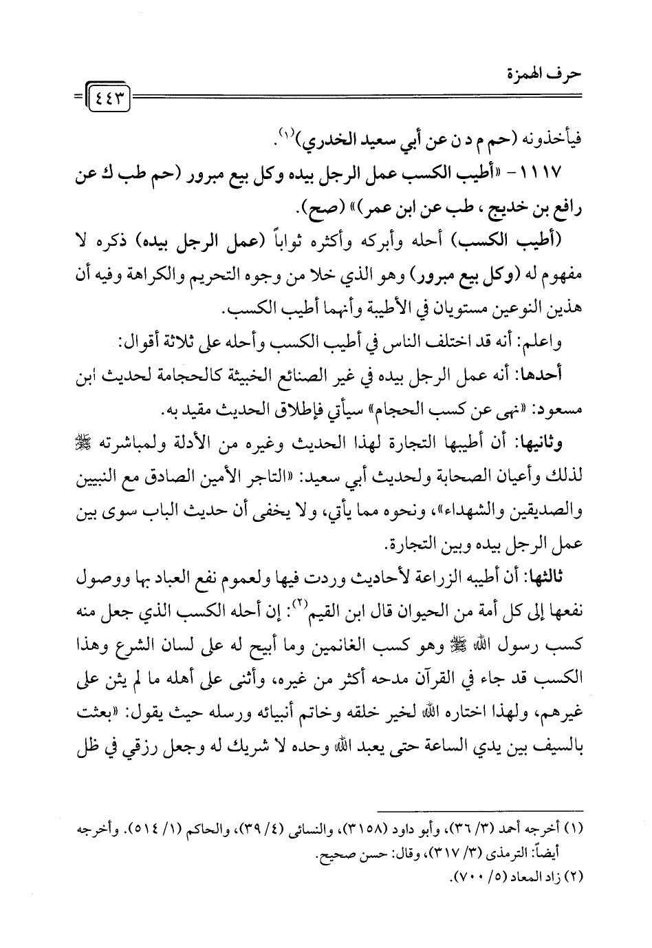 1117 - "أطيب الكسب عمل الرجل بيده وكل بيع مبرور (حم طب ك عن رافع بن خديج، طب عن ابن عمر) " (صح).