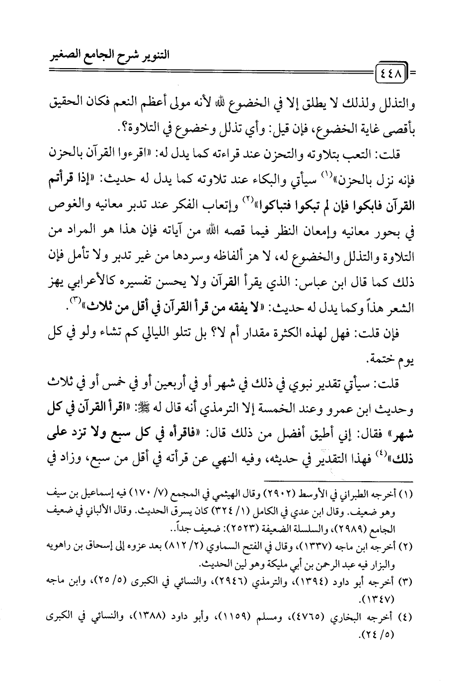 قلت: التعب بتلاوته والتحزن عند قراءته كما يدل له: "اقرءوا القرآن بالحزن فإنه نزل بالحزن" (¬1) سيأتي والبكاء عند تلاوته كما يدل له حديث: "إذا قرأتم القرآن فابكوا فإن لم تبكوا فتباكوا" (¬2) وإتعاب الفكر عند تدبر معانيه والغوص في بحور معانيه وإمعان النظر فيما قصه الله من آياته فإن هذا هو المراد من التلاوة والتذلل والخضوع له، لا هز ألفاظه وسردها من غير تدبر ولا تأمل فإن ذلك كما قال ابن عباس: الذي يقرأ القرآن ولا يحسن تفسيره كالأعرابي يهز الشعر هذاً وكما يدل له حديث: "لا يفقه من قرأ القرآن في أقل من ثلاث" (¬3).