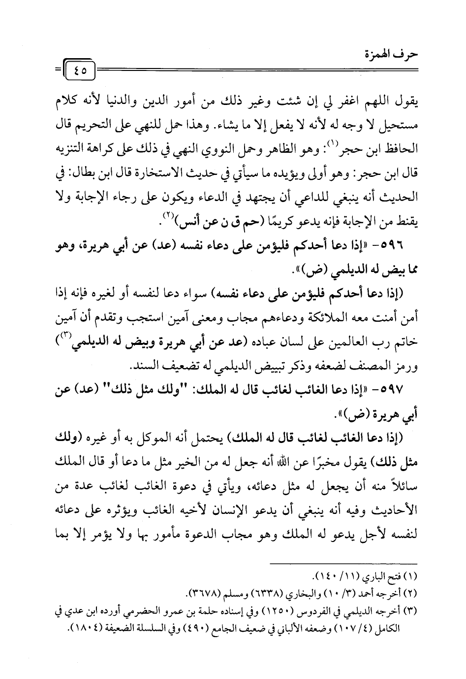 597 - " إذا دعا الغائب لغائب قال له الملك: "ولك مثل ذلك" (عد) عن أبي هريرة (ض) ".