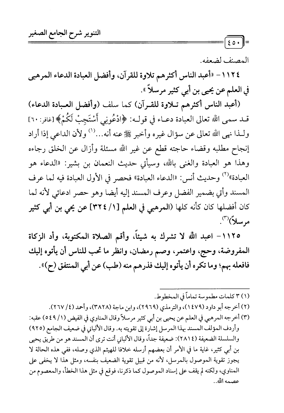 1124 - "أعبد الناس أكثرهم تلاوة للقرآن، وأفضل العبادة الدعاء المرهبى في العلم عن يحيى بن أبي كثير مرسلاً ".
