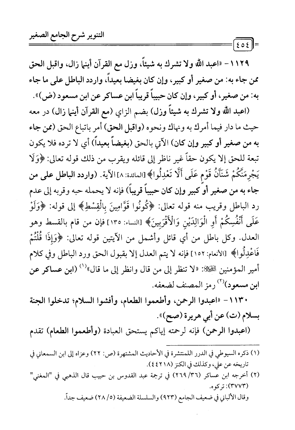 1130 - "اعبدوا الرحمن، وأطعموا الطعام، وأفشوا السلام؛ تدخلوا الجنة بسلام (ت) عن أبي هريرة (صح) "