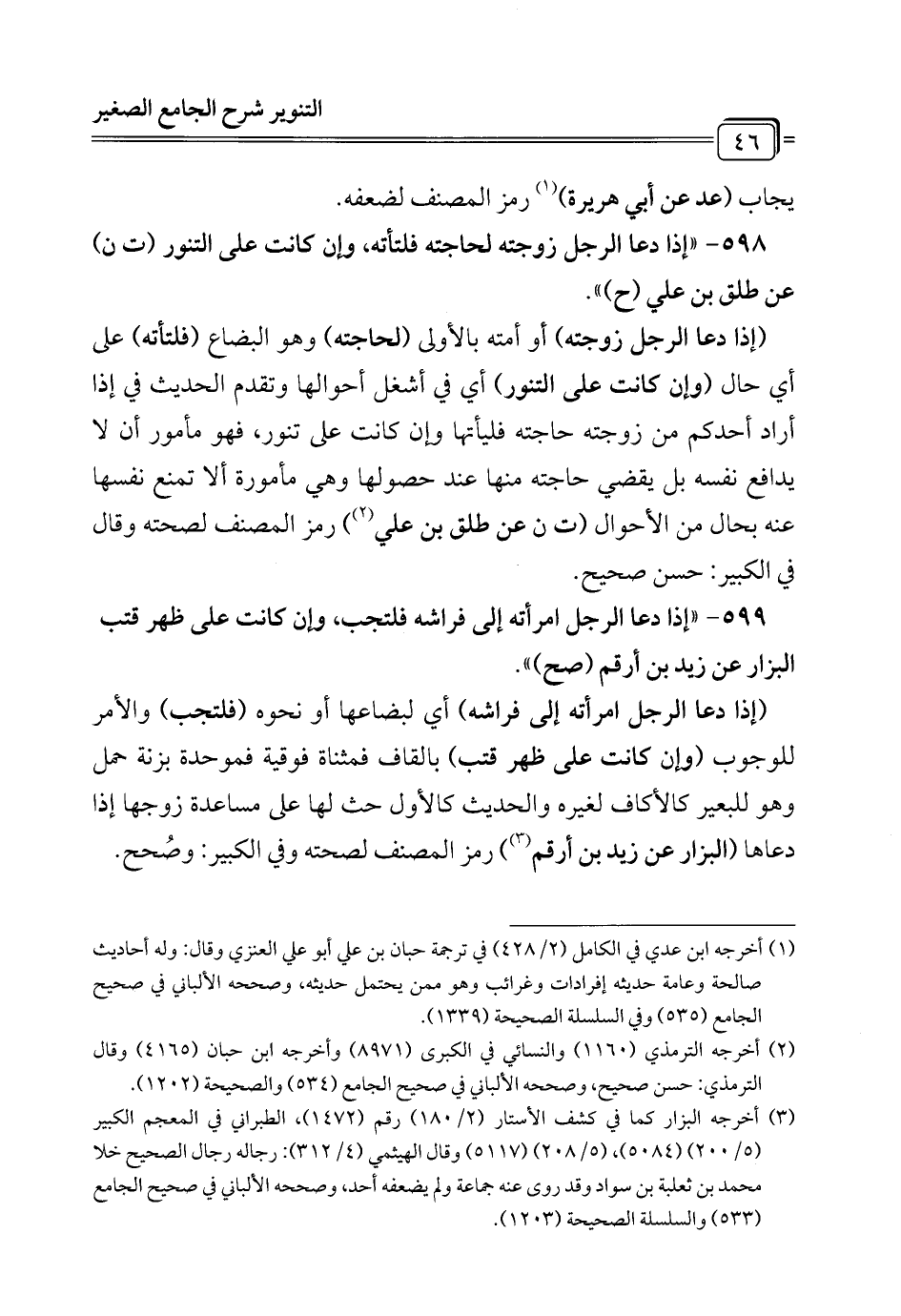 598 - " إذا دعا الرجل زوجته لحاجته فلتأته، وإن كانت على التنور (ت ن) عن طلق بن علي (ح) ".