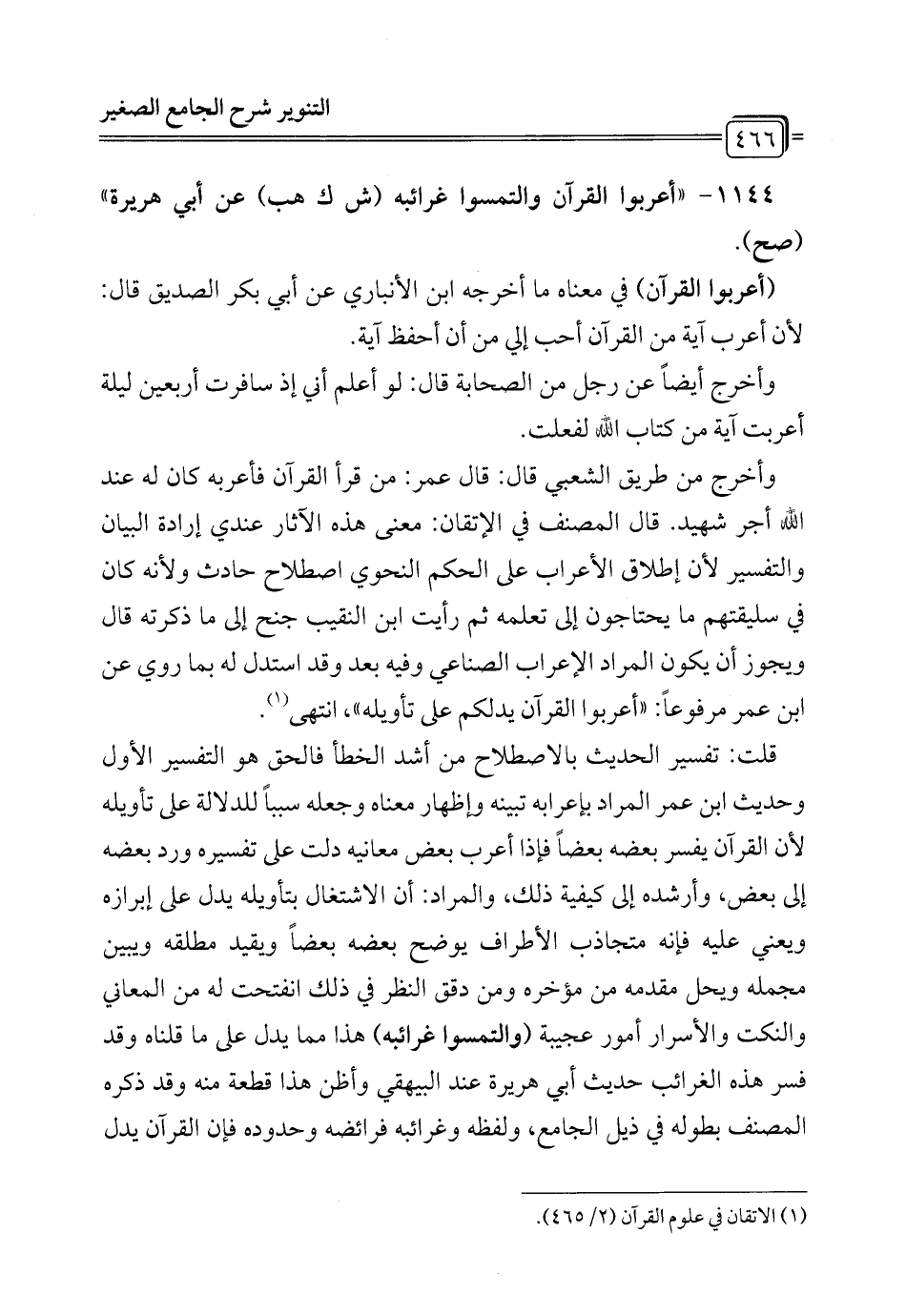 قلت: تفسير الحديث بالاصطلاح من أشد الخطأ فالحق هو التفسير الأول وحديث ابن عمر المراد بإعرابه تبينه وإظهار معناه وجعله سبباً للدلالة على تأويله لأن القرآن يفسر بعضه بعضاً فإذا أعرب بعض معانيه دلت على تفسيره ورد بعضه إلى بعض، وأرشده إلى كيفية ذلك، والمراد: أن الاشتغال بتأويله يدل على إبرازه ويعني عليه فإنه متجاذب الأطراف يوضح بعضه بعضاً ويقيد مطلقه ويبين مجمله ويحل مقدمه من مؤخره ومن دقق النظر في ذلك انفتحت له من المعاني والنكت والأسرار أمور عجيبة (والتمسوا غرائبه) هذا مما يدل على ما قلناه وقد فسر هذه الغرائب حديث أبي هريرة عند البيهقي وأظن هذا قطعة منه وقد ذكره المصنف بطوله في ذيل الجامع، ولفظه وغرائبه فرائضه وحدوده فإن القرآن يدل