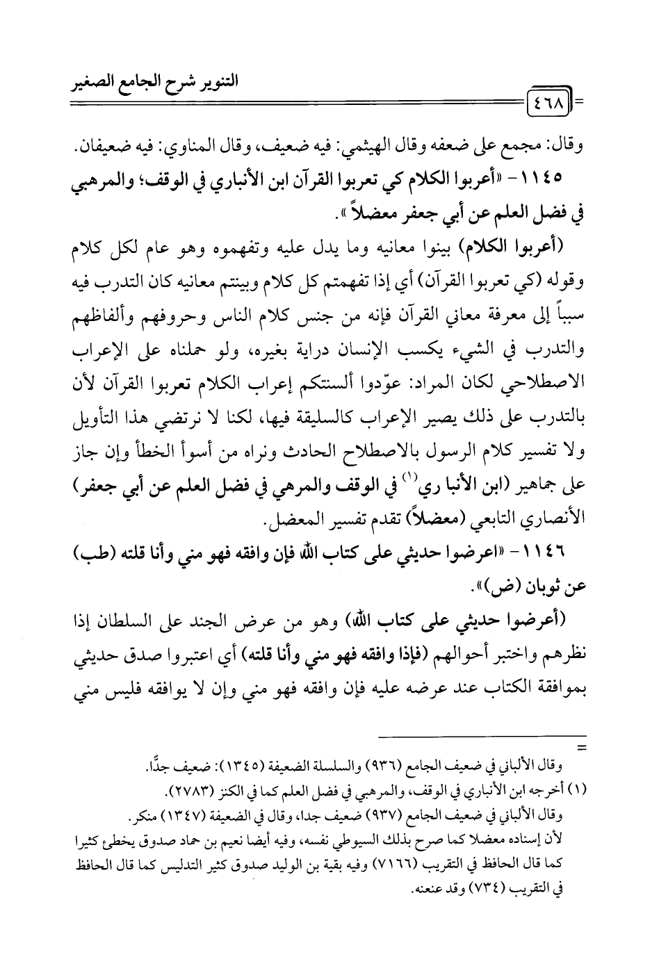 1145 - "أعربوا الكلام كي تعربوا القرآن ابن الأنباري في الوقف؛ والمرهبي في فضل العلم عن أبي جعفر معضلاً".