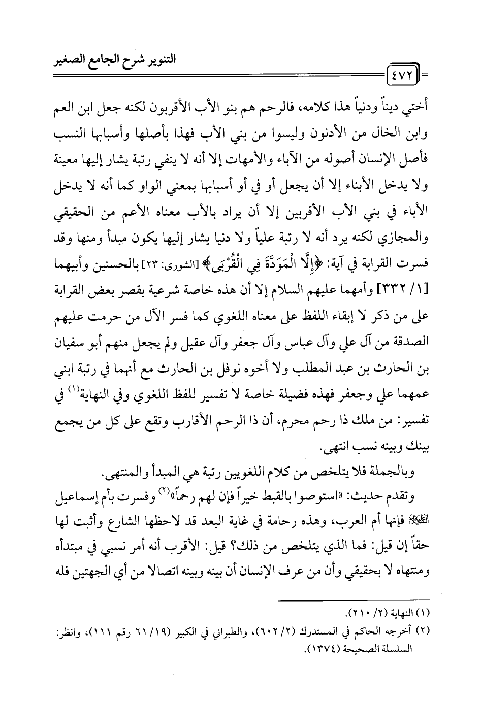 أختي دينًا ودنيًا هذا كلامه، فالرحم هم بنو الأب الأقربون لكنه جعل ابن العم وابن الخال من الأدنون وليسوا من بني الأب فهذا بأصلها وأسبابها النسب فأصل الإنسان أصوله من الآباء والأمهات إلا أنه لا ينفي رتبة يشار إليها معينة ولا يدخل الأبناء إلا أن يجعل أو في أو أسبابها بمعنى الواو كما أنه لا يدخل الآباء في بني الأب الأقربين إلا أن يراد بالأب معناه الأعم من الحقيقي والمجازي لكنه يرد أنه لا رتبة عليًا ولا دنيا يشار إليها يكون مبدأ ومنها وقد فسرت القرابة في آية: {إِلَّا الْمَوَدَّةَ فِي الْقُرْبَى} [الشورى: 23] بالحسنين وأبيهما [1/ 332] وأمهما عليهم السلام إلا أن هذه خاصة شرعية بقصر بعض القرابة على من ذكر لا إبقاء اللفظ على معناه اللغوي كما فسر الآل من حرمت عليهم الصدقة من آل علي وآل عباس وآل جعفر وآل عقيل ولم يجعل منهم أبو سفيان بن الحارث بن عبد المطلب ولا أخوه نوفل بن الحارث مع أنهما في رتبة ابني عمهما علي وجعفر فهذه فضيلة خاصة لا تفسير للفظ اللغوي وفي النهاية (¬1) في تفسير: من ملك ذا رحم محرم، أن ذا الرحم الأقارب وتقع على كل من يجمع بينك وبينه نسب انتهى.