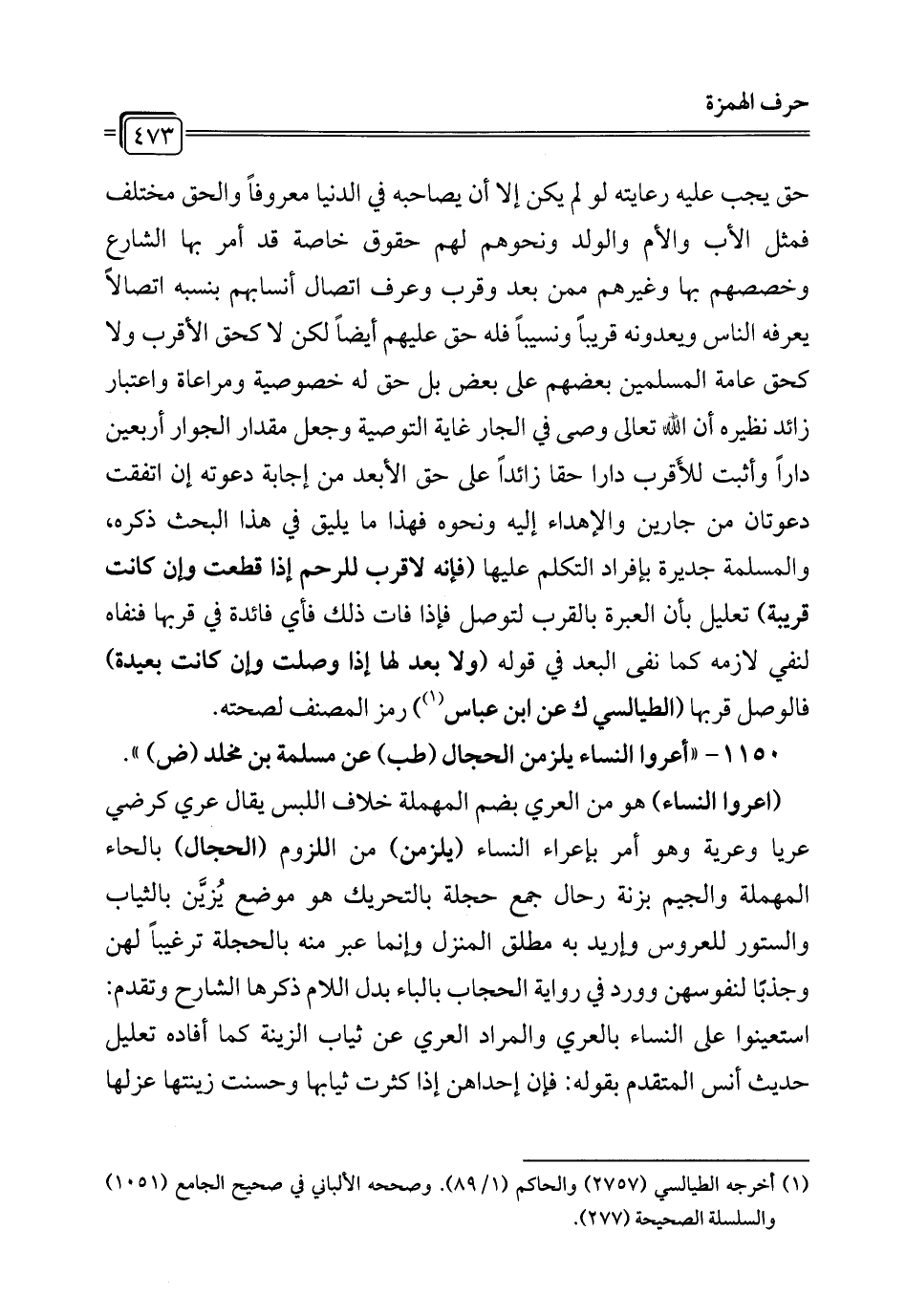 حق يجب عليه رعايته لو لم يكن إلا أن يصاحبه في الدنيا معروفًا والحق مختلف فمثل الأب والأم والولد ونحوهم لهم حقوق خاصة قد أمر بها الشارع وخصصهم بها وغيرهم ممن بعد وقرب وعرف اتصال أنسابهم بنسبه اتصالاً يعرفه الناس ويعدونه قريبًا ونسيبًا فله حق عليهم أيضًا لكن لا كحق الأقرب ولا كحق عامة المسلمين بعضهم على بعض بل حق له خصوصية ومراعاة واعتبار زائد نظيره أن الله تعالى وصى في الجار غاية التوصية وجعل مقدار الجوار أربعين دارًا وأثبت للأَقرب دارا حقا زائدًا على حق الأبعد من إجابة دعوته إن اتفقت دعوتان من جارين والإهداء إليه ونحوه فهذا ما يليق في هذا البحث ذكره، والمسلمة جديرة بإفراد التكلم عليها (فإنه لأقرب للرحم إذا قطعت وإن كانت قريبة) تعليل بأن العبرة بالقرب لتوصل فإذا فات ذلك فأي فائدة في قربها فنفاه لنفي لازمه كما نفى البعد في قوله (ولا بعد لها إذا وصلت وإن كانت بعيدة) فالوصل قربها (الطيالسي ك عن ابن عباس (¬1)) رمز المصنف لصحته.