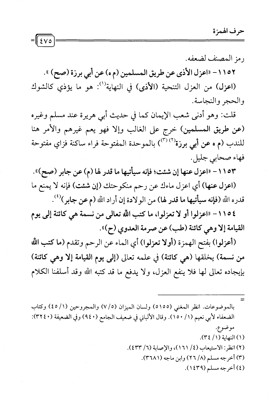 1154 - "اعزلوا أو لا تعزلوا، ما كتب الله تعالى من نسمة هي كائنة إلى يوم القيامة إلا وهي كائنة (طب) عن صرمة العدوي (ح) ".