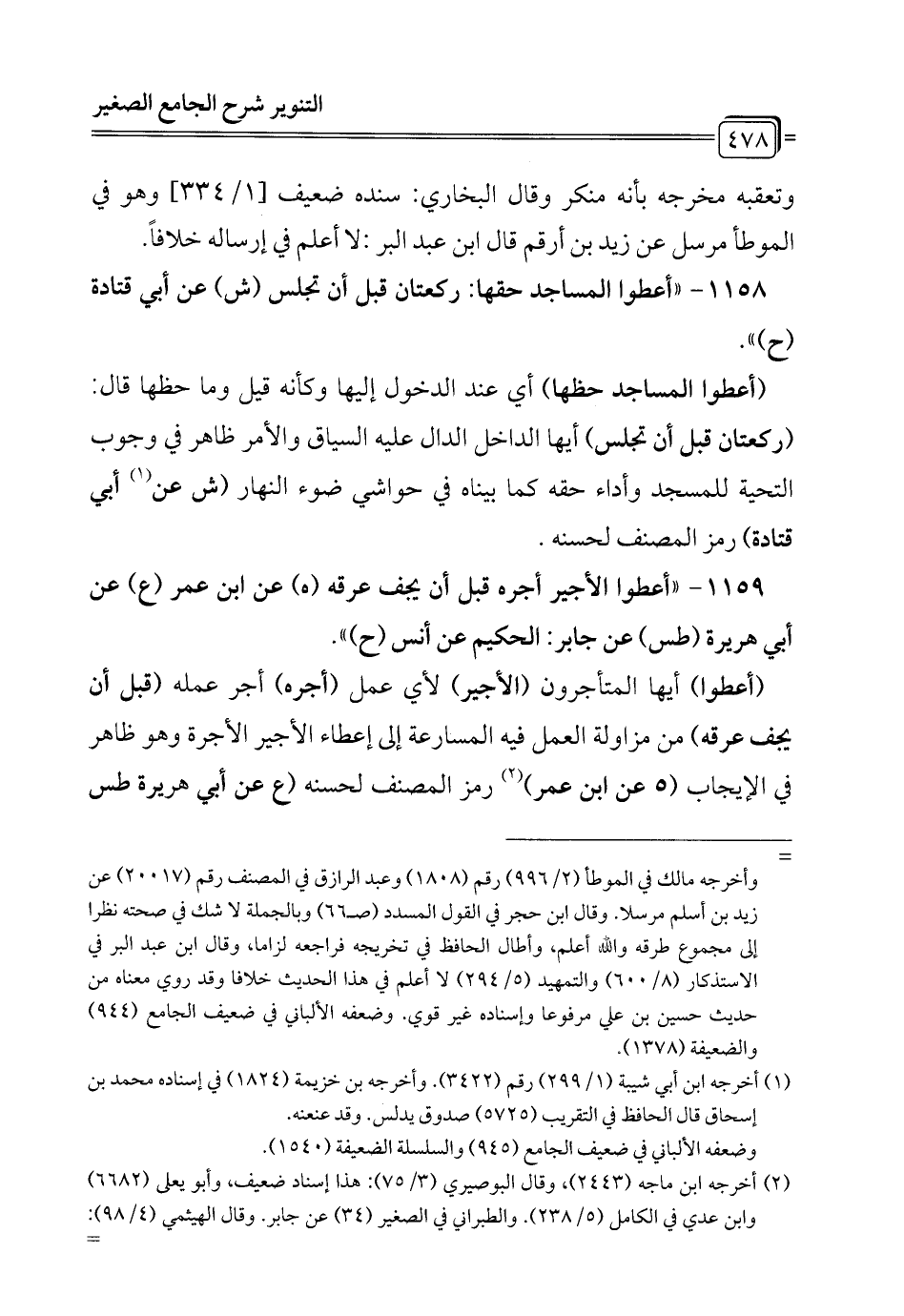 وتعقبه مخرجه بأنه منكر وقال البخاري: سنده ضعيف [1/ 334] وهو في الموطأ مرسل عن زيد بن أرقم قال ابن عبد البر: لا أعلم في إرساله خلافًا.