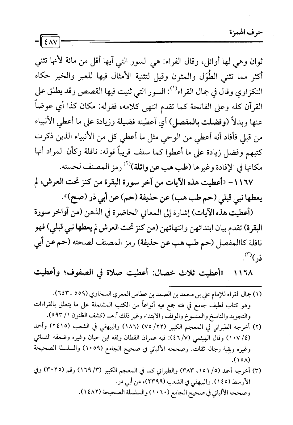 (¬1) جمال القراء للإمام علي بن محمد بن الصمد بن عطاس المعري السخاوي (559 - 643). وهو كتاب لطيف جامع في فنه جمع فيه أنواعًا من الكتب المشتملة على ما يتعلق بالقراءات والتجويد والناسخ والمنسوخ والوقف والابتداء وغير ذلك أ. هـ (كشف الظنون 1/ 593).
