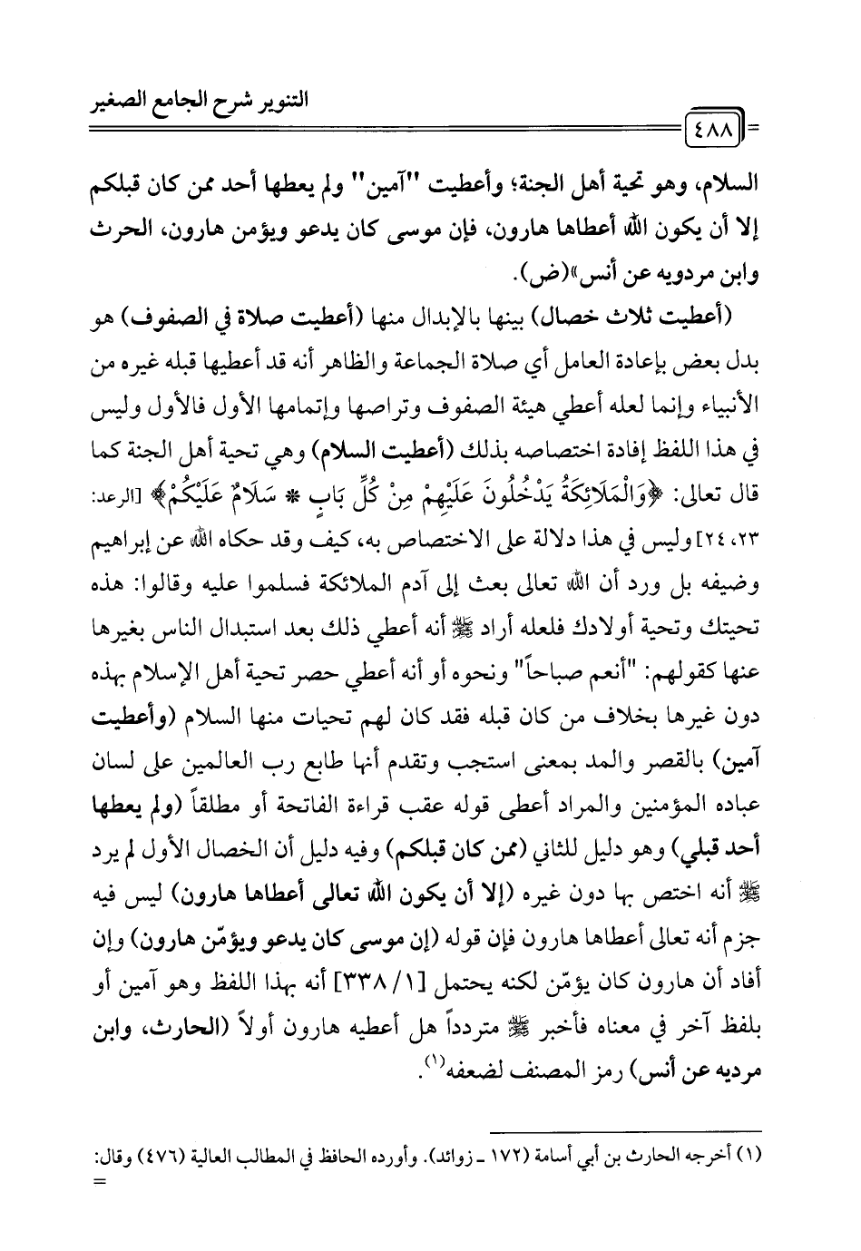 (أعطيت ثلاث خصال) بينها بالإبدال منها (أعطيت صلاة في الصفوف) هو بدل بعض بإعادة العامل أي صلاة الجماعة والظاهر أنه قد أعطيها قبله غيره من الأنبياء وإنما لعله أعطي هيئة الصفوف وتراصها وإتمامها الأول فالأول وليس في هذا اللفظ إفادة اختصاصه بذلك (أعطيت السلام) وهي تحية أهل الجنة كما قال تعالى: {وَالْمَلَائِكَةُ يَدْخُلُونَ عَلَيْهِمْ مِنْ كُلِّ بَابٍ (23) سَلَامٌ عَلَيْكُمْ} [الرعد: 23، 24] وليس في هذا دلالة على الاختصاص به، كيف وقد حكاه الله عن إبراهيم وضيفه بل ورد أن الله تعالى بعث إلى آدم الملائكة فسلموا عليه وقالوا: هذه تحيتك وتحية أولادك فلعله أراد - صلى الله عليه وسلم - أنه أعطي ذلك بعد استبدال الناس بغيرها عنها كقولهم: "أنعم صباحًا" ونحوه أو أنه أعطي حصر تحية أهل الإِسلام بهذه دون غيرها بخلاف من كان قبله فقد كان لهم تحيات منها السلام (وأعطيت آمين) بالقصر والمد بمعنى استجيب وتقدم أنها طابع رب العالمين على لسان عباده المؤمنين والمراد أعطى قوله عقب قراءة الفاتحة أو مطلقًا (ولم يعطها أحد قبلي) وهو دليل للثاني (ممن كان قبلكم) وفيه دليل أن الخصال الأول لم يرد - صلى الله عليه وسلم - أنه اختص بها دون غيره (إلا أن يكون الله تعالى أعطاها هارون) ليس فيه جزم أنه تعالى أعطاها هارون فإن قوله (إن موسى كان يدعو ويؤمّن هارون) وإن أفاد أن هارون كان يؤمّن لكنه يحتمل [1/ 338] أنه بهذا اللفظ وهو آمين أو بلفظ آخر في معناه فأخبر - صلى الله عليه وسلم - مترددًا هل أعطيه هارون أولاً (الحارث، وابن مرديه عن أنس) رمز المصنف لضعفه (¬1).