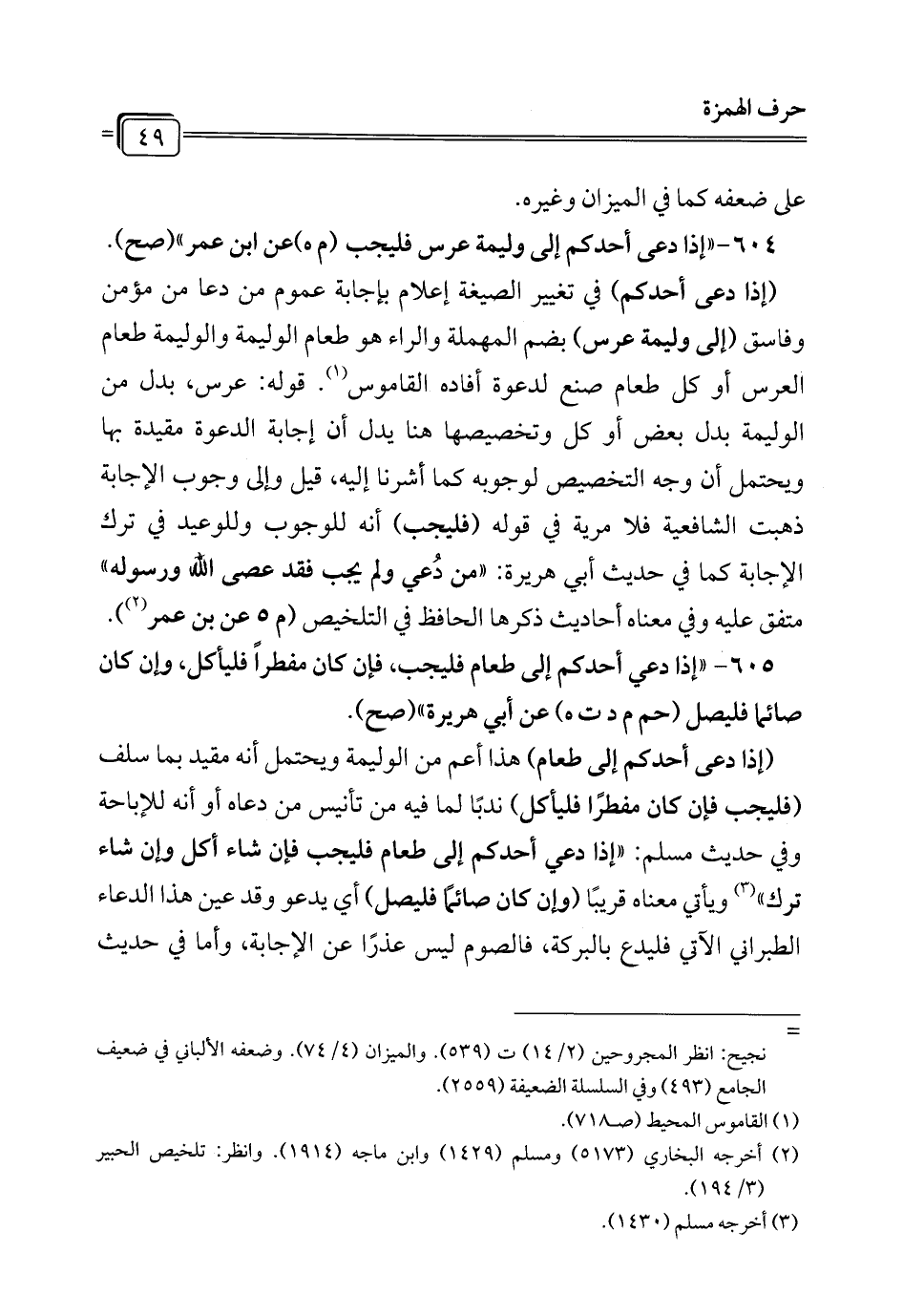 604 - " إذا دعى أحدكم إلى وليمة عرس فليجب (م هـ) عن ابن عمر" (صح).