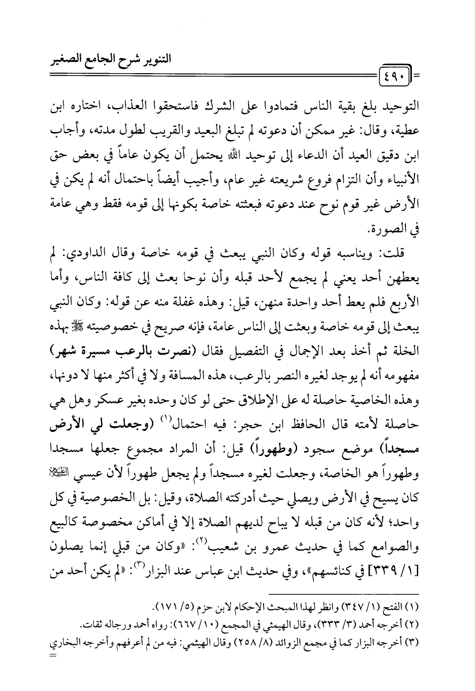 قلت: ويناسبه قوله وكان النبي يبعث في قومه خاصة وقال الداودي: لم يعطهن أحد يعني لم يجمع لأحد قبله وأن نوحا بعث إلى كافة الناس، وأما الأربع فلم يعط أحد واحدة منهن، قيل: وهذه غفلة منه عن قوله: وكان النبي يبعث إلى قومه خاصة وبعثت إلى الناس عامة، فإنه صريح في خصوصيته - صلى الله عليه وسلم - بهذه الخلة ثم أخذ بعد الإجمال في التفصيل فقال (نصرت بالرعب مسيرة شهر) مفهومه أنه لم يوجد لغيره النصر بالرعب، هذه المسافة ولا في أكثر منها لا دونها، وهذه الخاصية حاصلة له على الإطلاق حتى لو كان وحده بغير عسكر وهل هي حاصلة لأمته قال الحافظ ابن حجر: فيه احتمال (¬1) (وجعلت لي الأرض مسجدًا) موضع سجود (وطهورًا) قيل: أن المراد مجموع جعلها مسجدًا وطهورًا هو الخاصة، وجعلت لغيره مسجدًا ولم يجعل طهورًا لأن عيسى -عليه السلام- كان يسيح في الأرض ويصلي حيث أدركته الصلاة، وقيل: بل الخصوصية في كل واحد؛ لأنه كان من قبله لا يباح لديهم الصلاة إلا في أماكن مخصوصة كالبيع والصوامع كما في حديث عمرو بن شعيب (¬2): "وكان من قبلي إنما يصلون [1/ 339] في كنائسهم"، وفي حديث ابن عباس عند البزار (¬3): "لم يكن أحد من