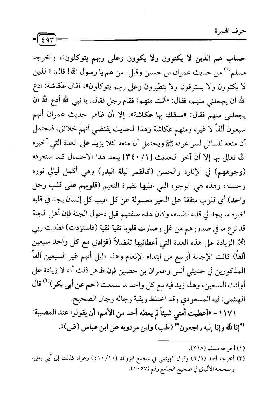 حساب هم الذين لا يكتوون ولا يكوون وعلى ربهم يتوكلون "، وأخرجه مسلم (¬1) من حديث عمران بن حسين وقيل: من هم يا رسول الله! قال: "الذين لا يكتوون ولا يسترقون ولا يتطيرون وعلى ربهم يتوكلون"، فقال عكاشة: ادع الله أن يجعلني منهم، فقال: "أنت منهم" فقام رجل فقال: يا نبي الله أدع الله أن يجعلني منهم فقال: "سبقك بها عكاشة". إلا أن ظاهر حديث عمران أنهم سبعون ألفًا لا غير، ومنهم عكاشة وهذا الحديث يقتضي أنهم خلائق، فيحتمل أن منعه للسائل لسر عرفه - صلى الله عليه وسلم - ويحتمل أن منعه لئلا يزيد على العدة التي أخبره الله تعالى بها إلا أن آخر الحديث [1/ 340] يبعد هذا الاحتمال كما سنعرفه (وجوههم) في الإنارة والحسن (كالقمر ليلة البدر) وهي أكمل ليالي نوره وحسنه، وهذه هي الوجوه التي عليها نضرة النعيم (قلوبهم على قلب رجل واحد) أي قلوب متفقة على الخير مغسولة عن كل عيب كل إنسان يجد في قلبه لغيره ما يجد في قلبه لنفسه، وكان هذه صفتهم قبل دخول الجنة فإن أهل الجنة قد نزع ما في صدورهم من غل وصارت قلوبا تقية نقية (فاستزدت) فطلبت ربي -عز وجل- الزيادة على هذه العدة التي أعطانيها تفضلاً (فزادني مع كل واحد سبعين ألفًا) كانت الإجابة أوسع من ابتداء الإنعام وهذا دليل أنهم غير السبعين ألفًا المذكورين في حديثي أنس وعمران بن حصين فإن ظاهر ذلك أنه لا زيادة على أولئك السبعين، وهذا زيد فيه مع كل واحد ما سمعت (حم عن أبي بكر) (¬2) قال الهيثمي: فيه المسعودي وقد اختلط وبقية رجاله رجال الصحيح.