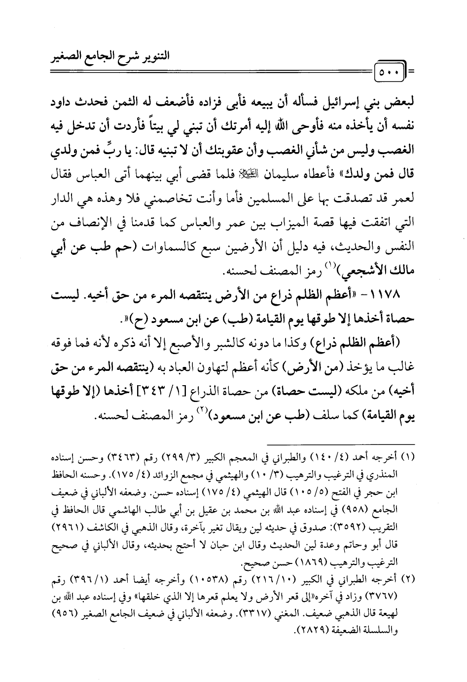 1178 - "أعظم الظلم ذراع من الأرض ينتقصه المرء من حق أخيه. ليست حصاة أخذها إلا طوقها يوم القيامة (طب) عن ابن مسعود (ح) ".