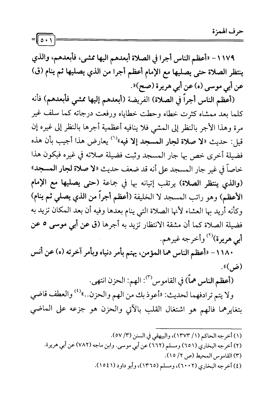 1179 - "أعظم الناس أجرا في الصلاة أبعدهم إليها ممشى، فأبعدهم، والذي ينتظر الصلاة حتى يصليها مع الإِمام أعظم أجرا من الذي يصليها ثم ينام (ق) عن أبي موسى (هـ) عن أبي هريرة (صح) ".