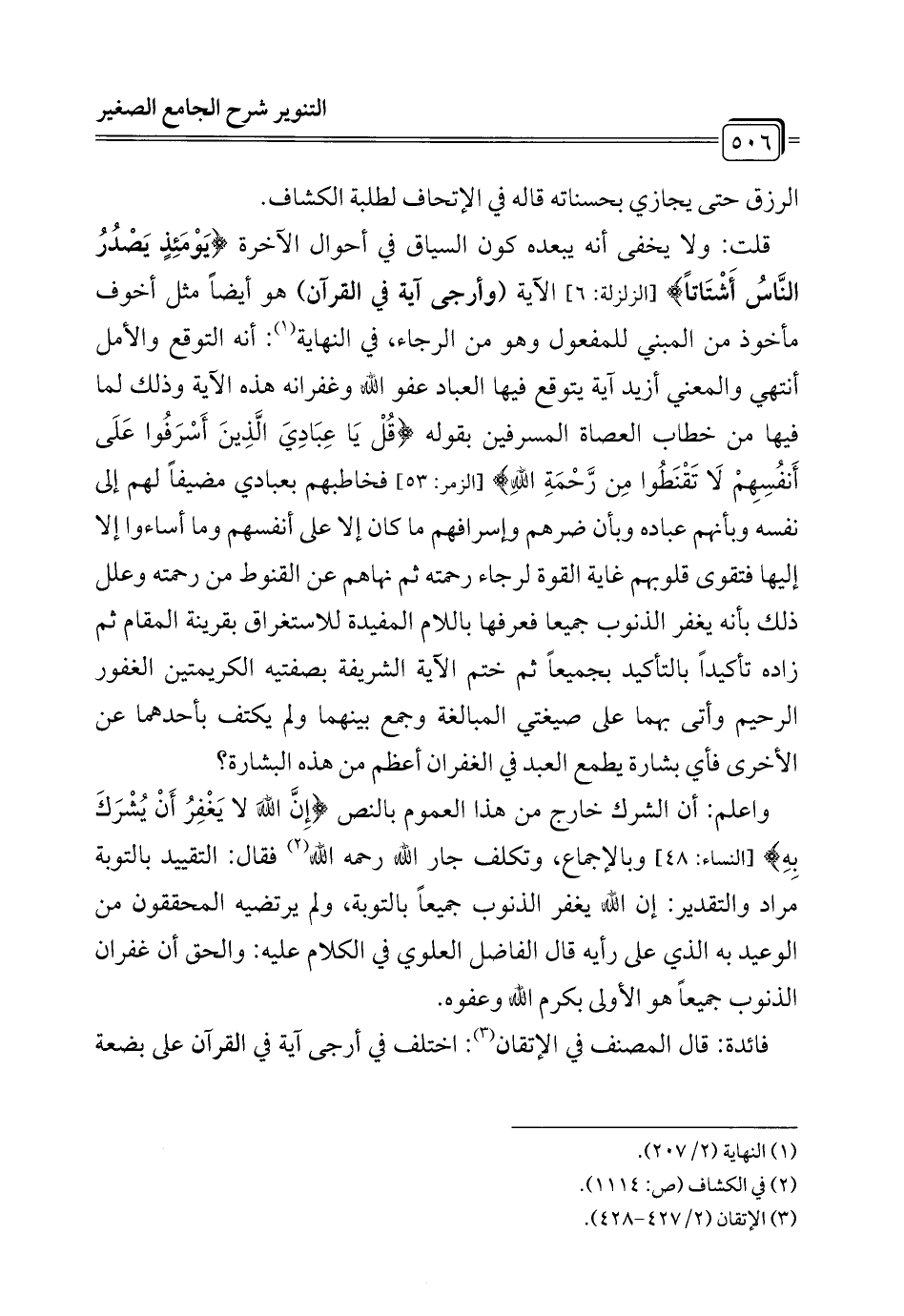 قلت: ولا يخفى أنه يبعده كون السياق في أحوال الآخرة {يَوْمَئِذٍ يَصْدُرُ النَّاسُ أَشْتَاتًا} [الزلزلة: 6] الآية (وأرجى آية في القرآن) هو أيضًا مثل أخوف مأخوذ من المبني للمفعول وهو من الرجاء، في النهاية (¬1): أنه التوقع والأمل أنتهي والمعني أزيد آية يتوقع فيها العباد عفو الله وغفرانه هذه الآية وذلك لما فيها من خطاب العصاة المسرفين بقوله {قُلْ يَا عِبَادِيَ الَّذِينَ أَسْرَفُوا عَلَى أَنْفُسِهِمْ لَا تَقْنَطُوا مِنْ رَحْمَةِ اللَّهِ} [الزمر: 53] فخاطبهم بعبادي مضيفًا لهم إلى نفسه وبأنهم عباده وبأن ضرهم وإسرافهم ما كان إلا على أنفسهم وما أساءوا إلا إليها فتقوى قلوبهم غاية القوة لرجاء رحمته ثم نهاهم عن القنوط من رحمته وعلل ذلك بأنه يغفر الذنوب جميعًا فعرفها باللام المفيدة للاستغراق بقرينة المقام ثم زاده تأكيدًا بالتأكيد بجميعًا ثم ختم الآية الشريفة بصفتيه الكريمتين الغفور الرحيم وأتى بهما على صيغتي المبالغة وجمع بينهما ولم يكتف بأحدهما عن الأخرى فأي بشارة يطمع العبد في الغفران أعظم من هذه البشارة؟