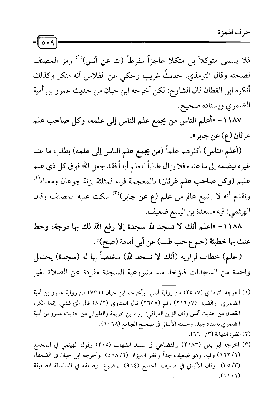 1188 - "اعلم أنك لا تسجد لله سجدة إلا رفع الله لك بها درجة، وحط عنك بها خطيئة (حم ع حب طب) عن أبي أمامة (صح) ".