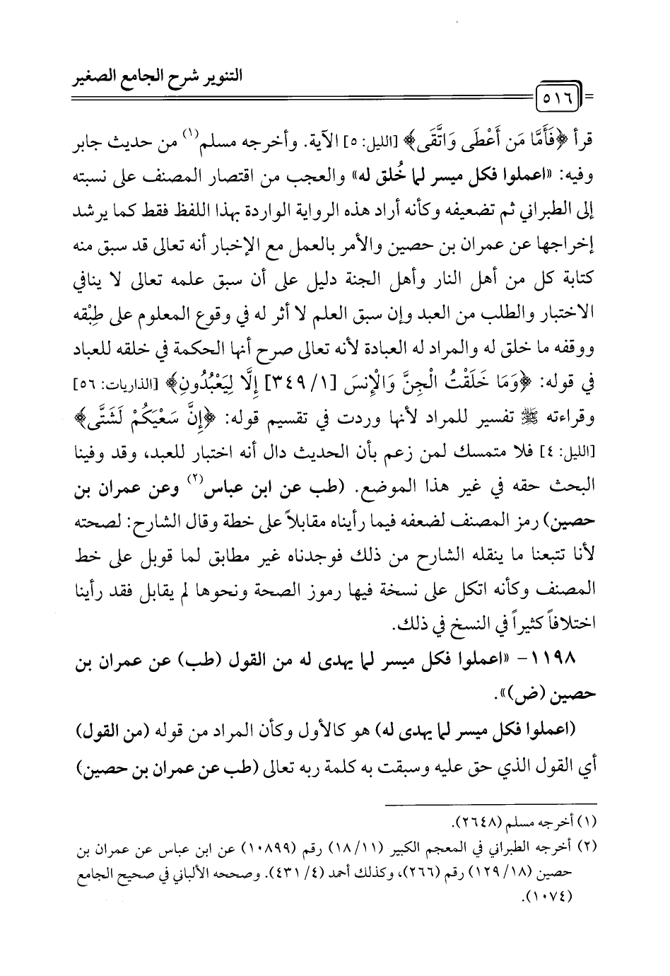 1198 - "اعملوا فكل ميسر لما يهدى له من القول (طب) عن عمران بن حصين (ض) ".