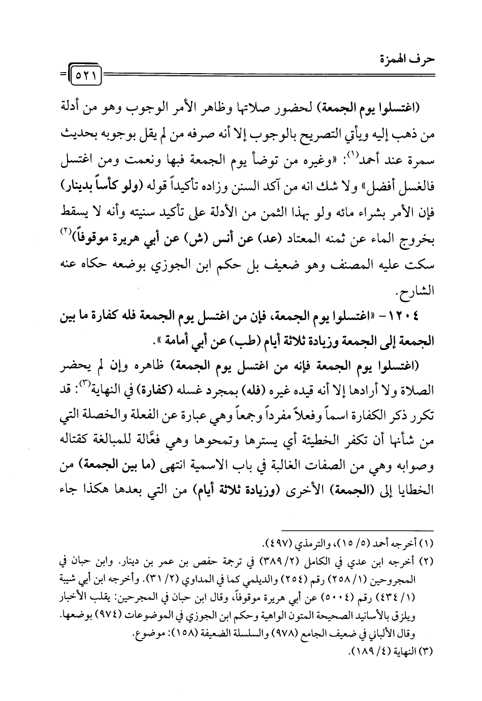 1204 - "اغتسلوا يوم الجمعة، فإن من اغتسل يوم الجمعة فله كفارة ما بين الجمعة إلى الجمعة وزيادة ثلاثة أيام (طب) عن أبي أمامة".