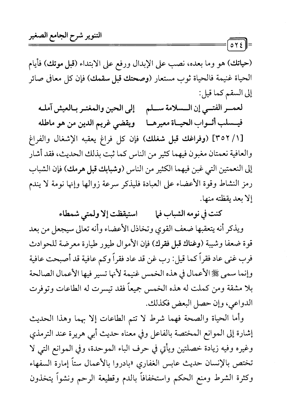 [1/ 352] (وفراغك قبل شغلك) فإن كل فراغ يعقبه الإشغال والفراغ والعافية نعمتان مغبون فيهما كثير من الناس كما ثبت بذلك الحديث، فقد أشار إلى النعمتين التي غبن فيهما الكثير من الناس (وشبابك قبل هرمك) فإن الشباب رمز النشاط وقوة الأعضاء على العبادة فليذكر سرعة زوالها وإنها نومة لا يندم إلا بعد يقظته منها.
