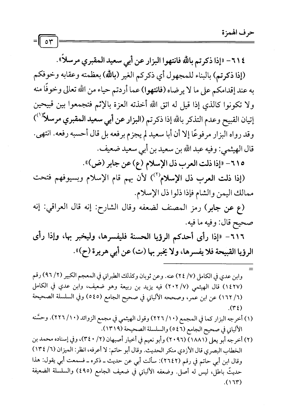 616 - " إذا رأى أحدكم الرؤيا الحسنة فليفسرها، وليخبر بها، وإذا رأى الرؤيا القبيحة فلا يفسرها، ولا يخبر بها (ت) عن أبي هريرة (ح) ".