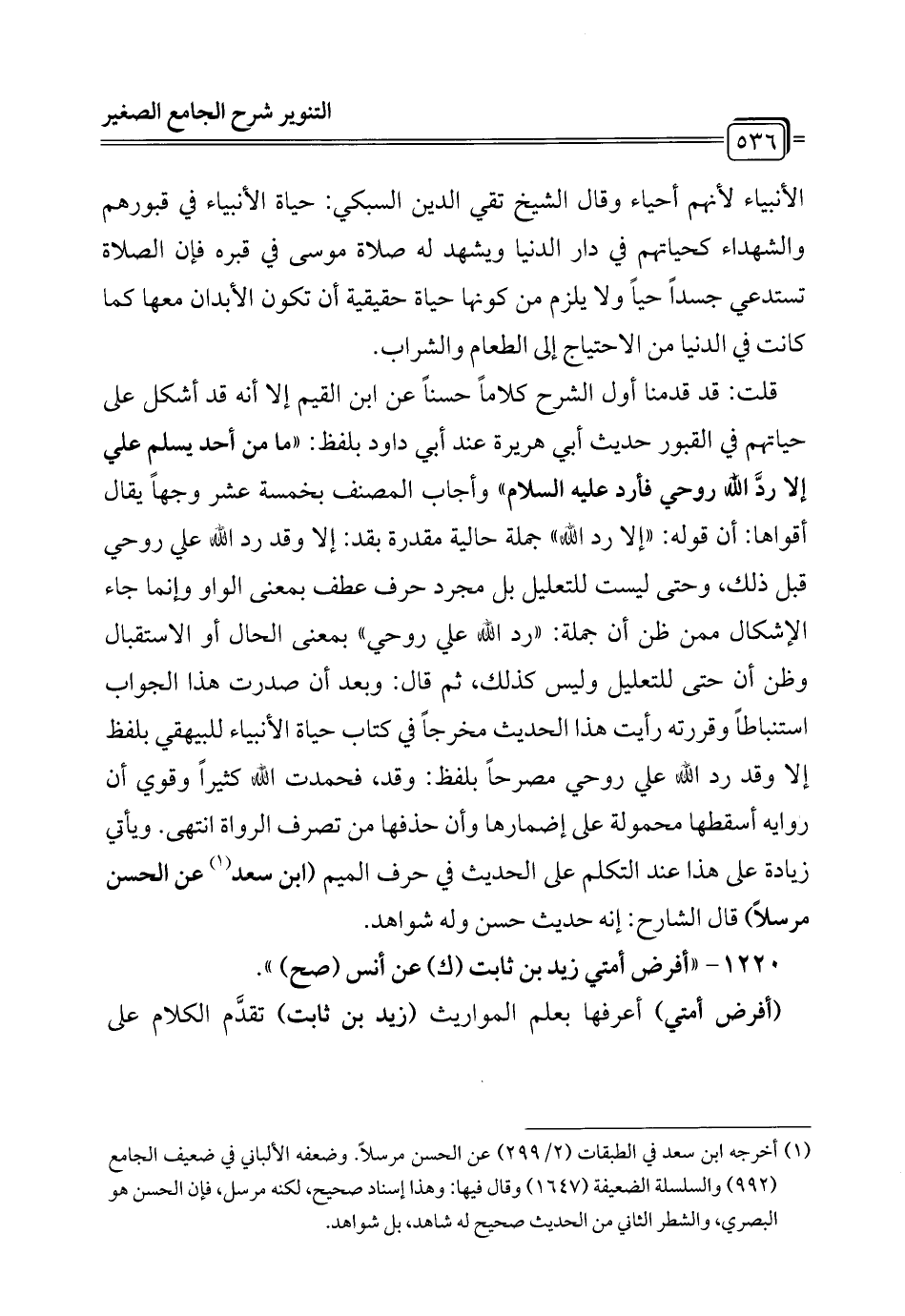 قلت: قد قدمنا أول الشرح كلامًا حسنًا عن ابن القيم إلا أنه قد أشكل على حياتهم في القبور حديث أبي هريرة عند أبي داود بلفظ: "ما من أحد يسلم علي إلا ردَّ الله روحي فأرد عليه السلام" وأجاب المصنف بخمسة عشر وجهًا يقال أقواها: أن قوله: "إلا رد الله" جملة حالية مقدرة بقد: إلا وقد رد الله علي روحي قبل ذلك، وحتى ليست للتعليل بل مجرد حرف عطف بمعنى الواو وإنما جاء الإشكال ممن ظن أن جملة: "رد الله علي روحي" بمعنى الحال أو الاستقبال وظن أن حتى للتعليل وليس كذلك، ثم قال: وبعد أن صدرت هذا الجواب استنباطًا وقررته رأيت هذا الحديث مخرجًا في كتاب حياة الأنبياء للبيهقي بلفظ إلا وقد رد الله علي روحي مصرحًا بلفظ: وقد، فحمدت الله كثيرًا وقوي أن روايه أسقطها محمولة على إضمارها وأن حذفها من تصرف الرواة انتهى. ويأتي زيادة على هذا عند التكلم على الحديث في حرف الميم (ابن سعد (¬1) عن الحسن مرسلاً) قال الشارح: إنه حديث حسن وله شواهد.