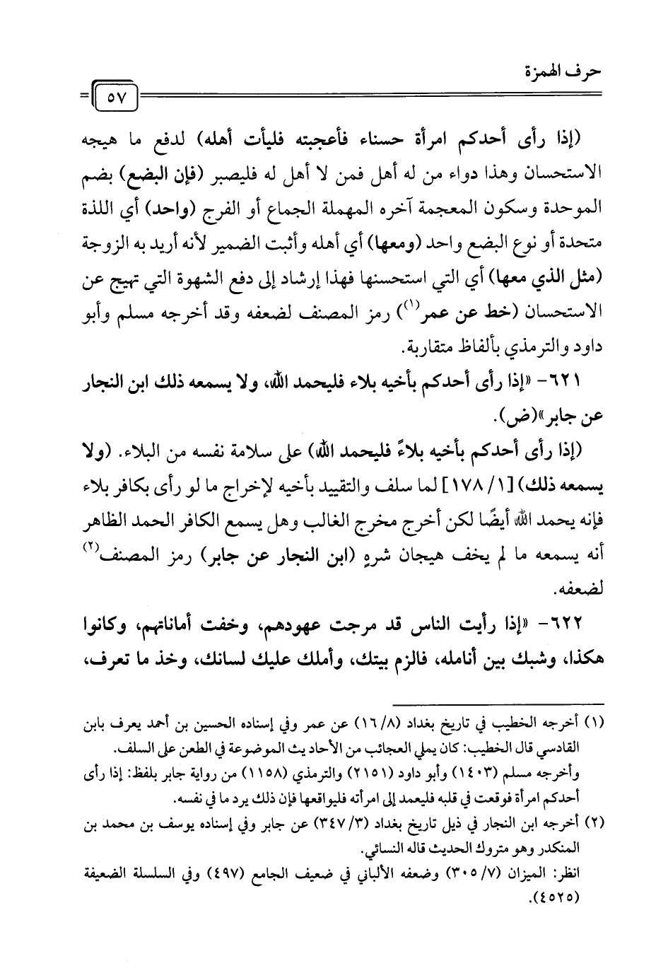 621 - " إذا رأى أحدكم بأخيه بلاءً فليحمد الله، ولا يسمعه ذلك ابن النجار عن جابر" (ض).