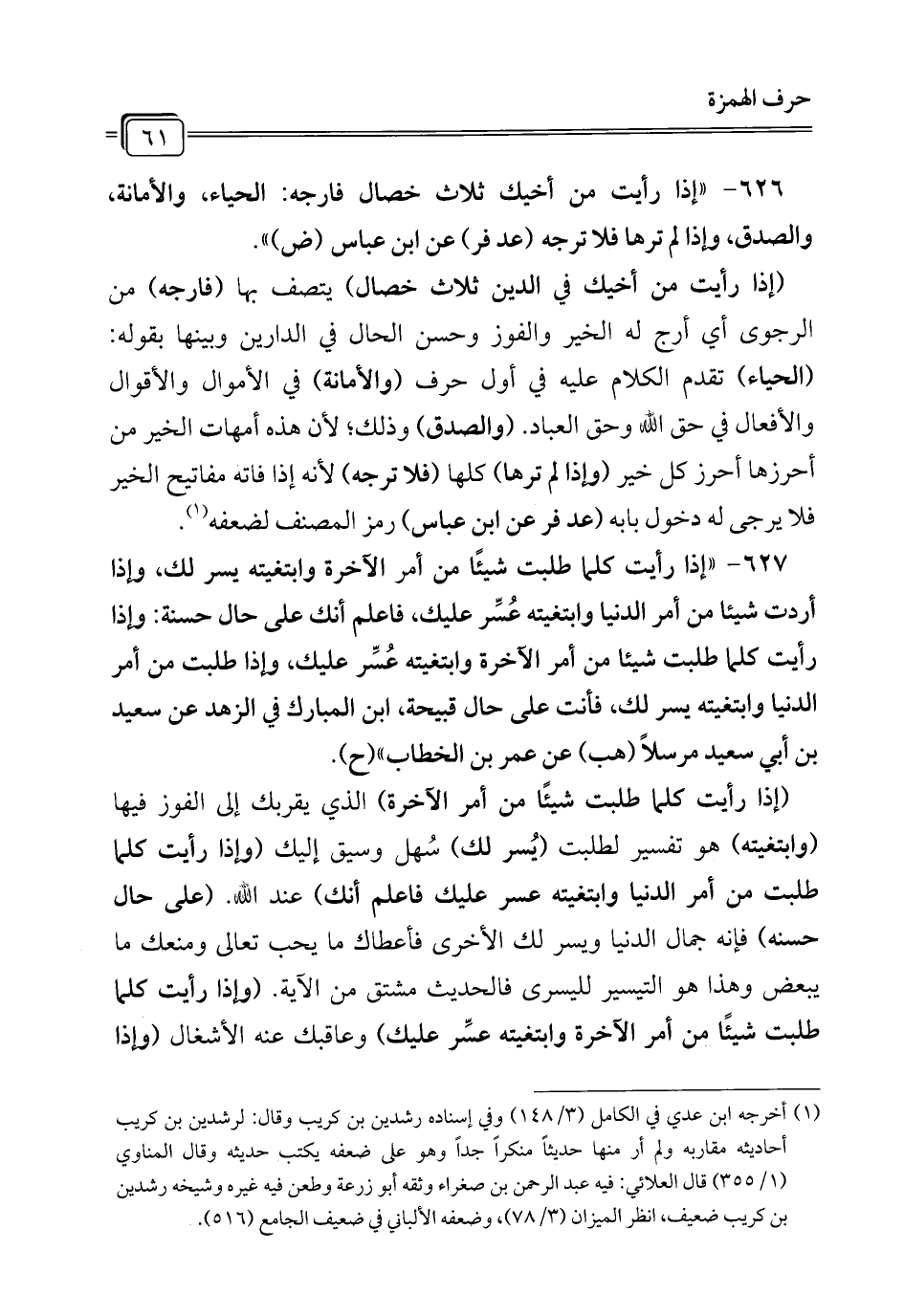 627 - " إذا رأيت كلما طلبت شيئًا من أمر الآخرة وابتغيته يسر لك، وإذا أردت شيئاً من أمر الدنيا وابتغيته عُسِّر عليك، فاعلم أنك على حال حسنة: وإذا رأيت كلما طلبت شيئاً من أمر الآخرة وابتغيته عُسِّر عليك، وإذا طلبت من أمر الدنيا وابتغيته يسر لك، فأنت على حال قبيحة، ابن المبارك في الزهد عن سعيد بن أبي سعيد مرسلاً (هب) عن عمر بن الخطاب" (ح).