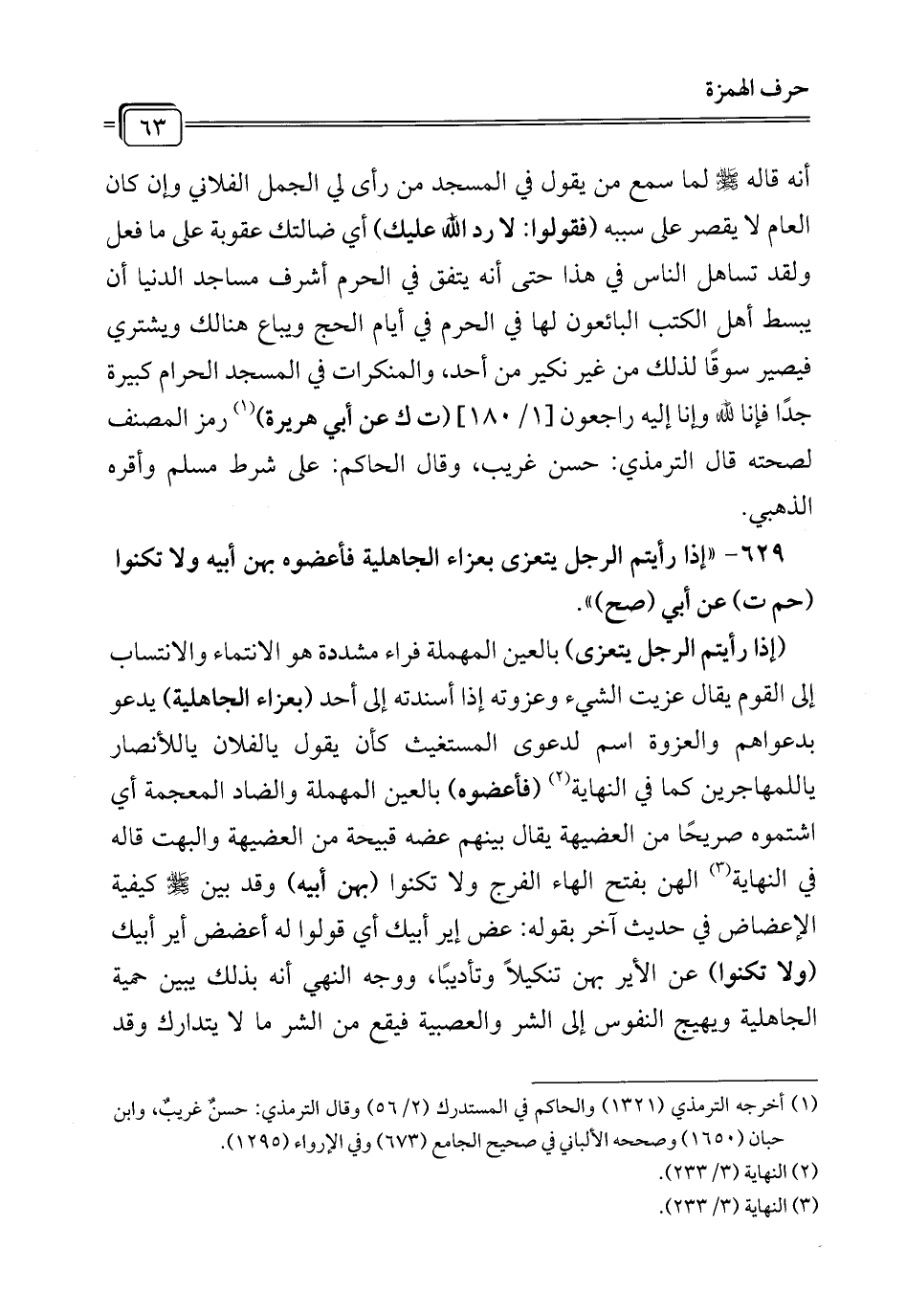 أنه قاله - صلى الله عليه وسلم - لما سمع من يقول في المسجد من رأى لي الجمل الفلاني وإن كان العام لا يقصر على سببه (فقولوا: لا رد الله عليك) أي ضالتك عقوبة على ما فعل ولقد تساهل الناس في هذا حتى أنه يتفق في الحرم أشرف مساجد الدنيا أن يبسط أهل الكتب البائعون لها في الحرم في أيام الحج ويباع هنالك ويشتري فيصير سوقًا لذلك من غير نكير من أحد، والمنكرات في المسجد الحرام كبيرة جدًا فإنا لله وإنا إليه راجعون [1/ 180] (ت ك عن أبي هريرة) (¬1) رمز المصنف لصحته قال الترمذي: حسن غريب، وقال الحاكم: على شرط مسلم وأقره الذهبي.