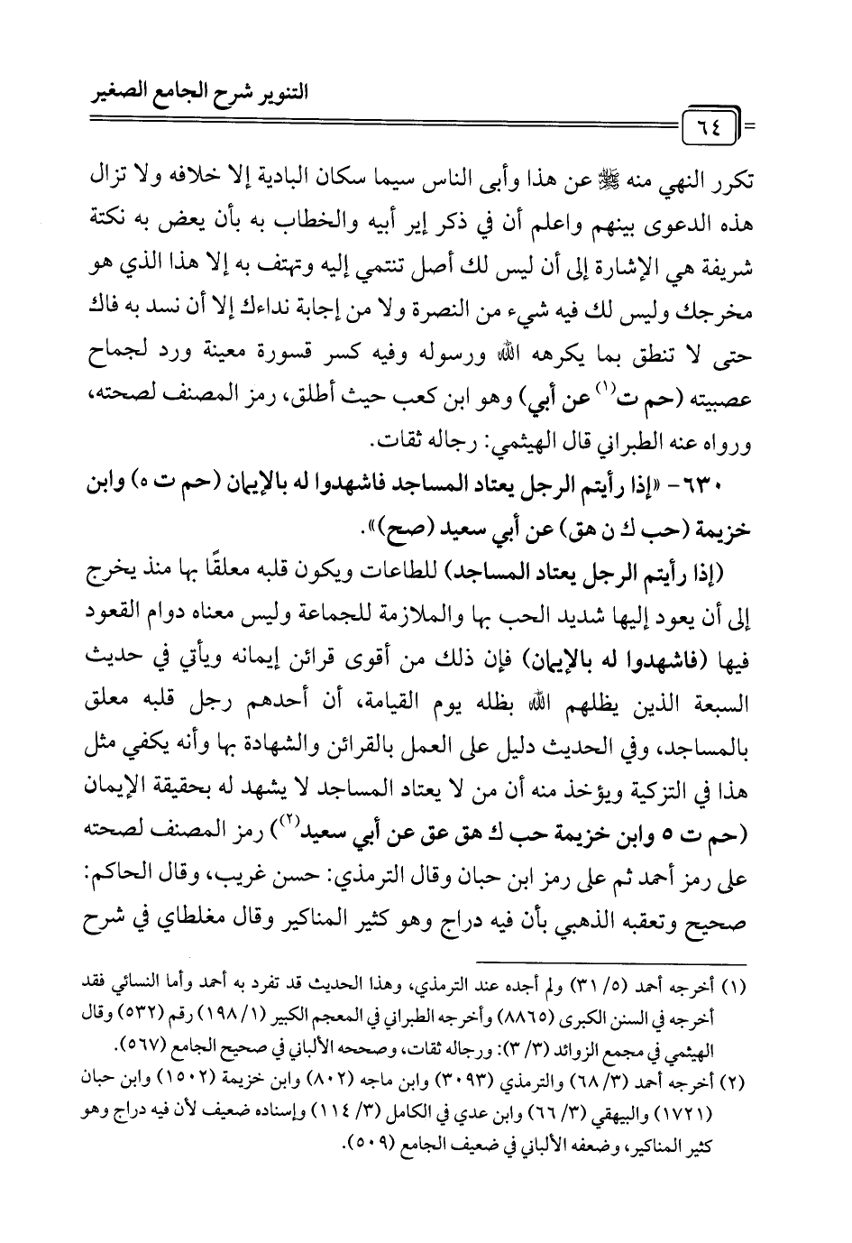 630 - " إذا رأيتم الرجل يعتاد المساجد فاشهدوا له بالإيمان (حم ت هـ) وابن خزيمة (حب ك ن هق) عن أبي سعيد (صح) ".