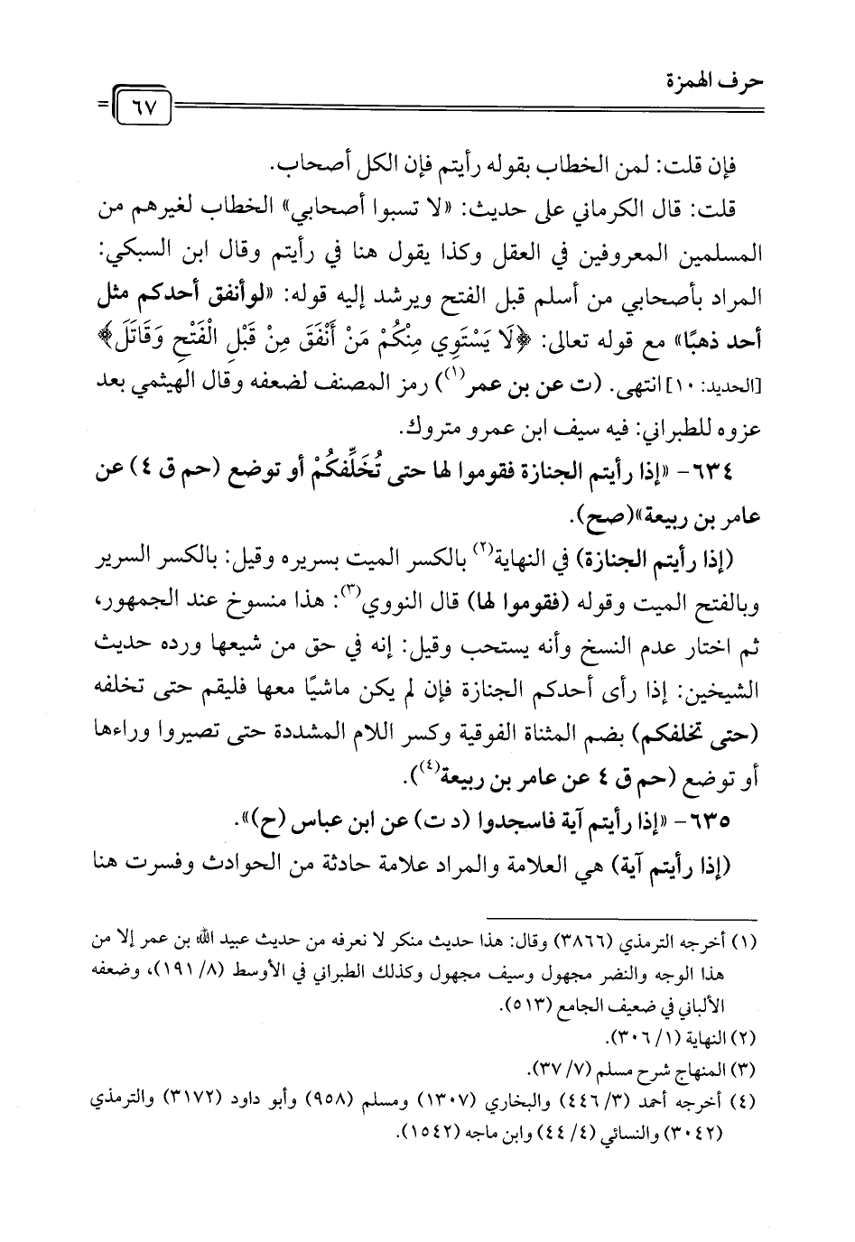 634 - " إذا رأيتم الجنازة فقوموا لها حتى تُخَلِّفكُمْ أو توضع (حم ق 4) عن عامر بن ربيعة" (صح).