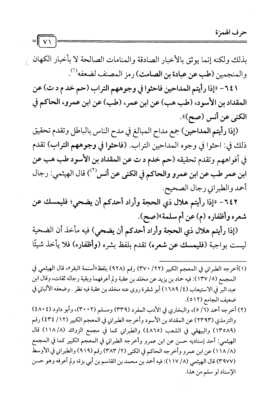 641 - " إذا رأيتم المداحين فاحثوا في وجوههم التراب (حم خدم د ت) عن المقداد بن الأسود، (طب هب) عن ابن عمر، (طب) عن ابن عمرو، الحاكم في الكنى عن أنس (صح) ".